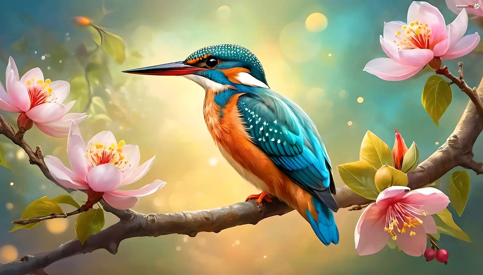 Zimorodek, Ptak, Różowy, Kwiat, Gałąź, Grafika - Zdjęcia