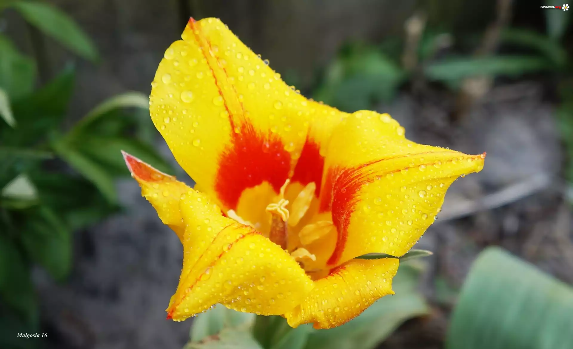 Kwiat Kwiat, Żółty, Czerwony, Tulipan, Krople, Rosa