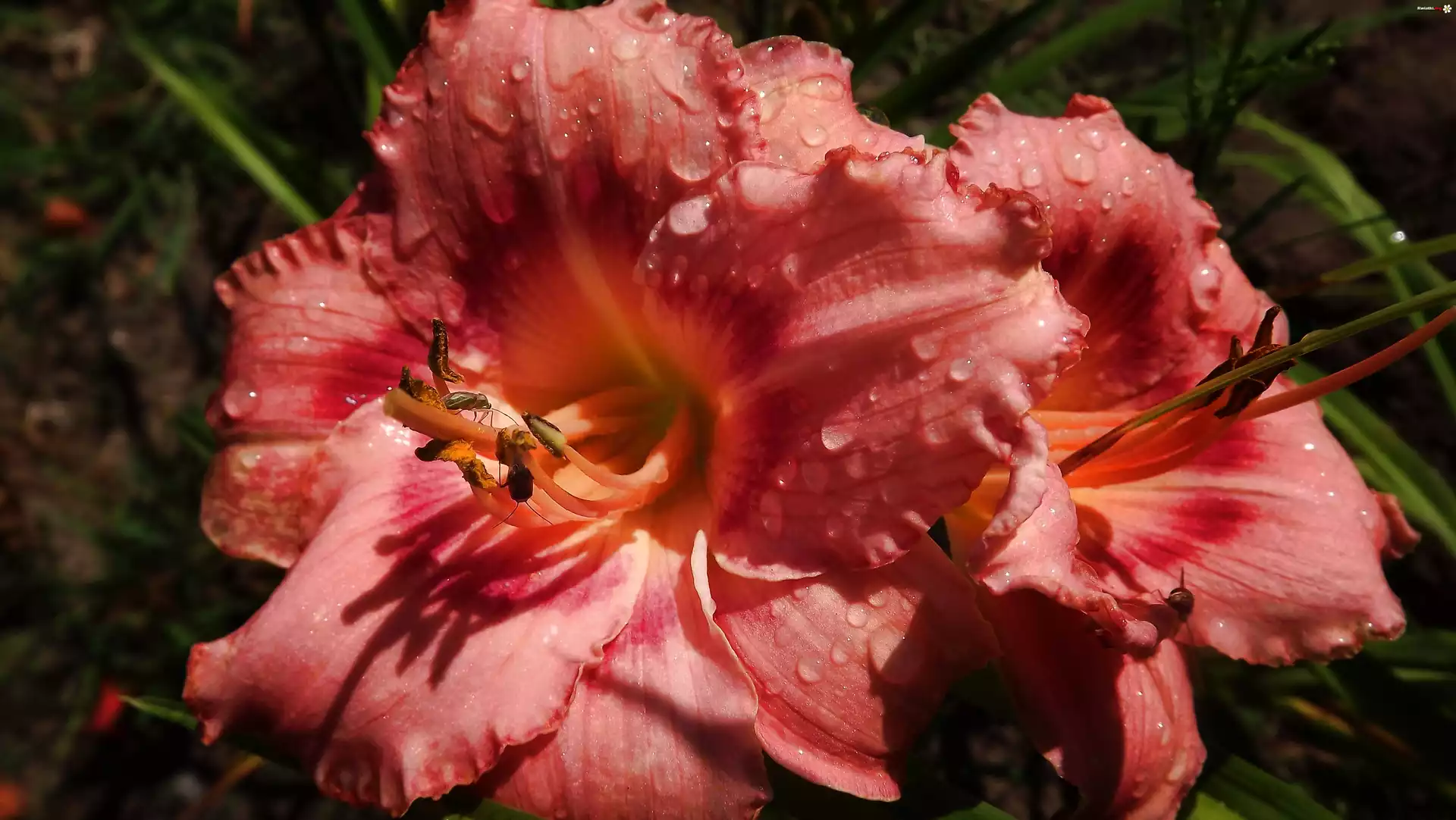 Kwiat, Liliowiec, Różowo, Bordowy, Krople, Deszczu - Zdjęcia