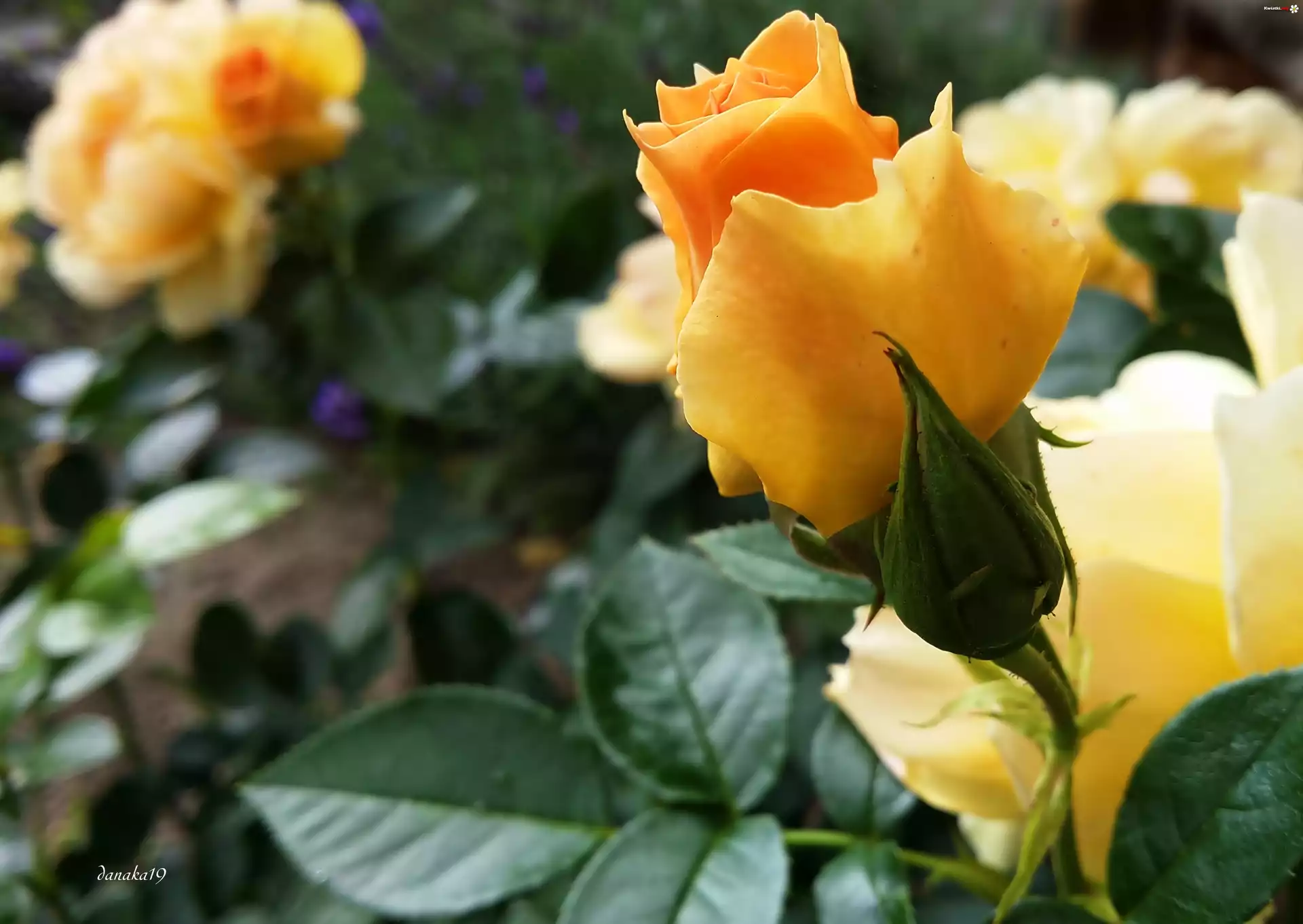 Kwiat, Żółto, Pomarańczowa, Róża, Pączek, Liście - Zdjęcia