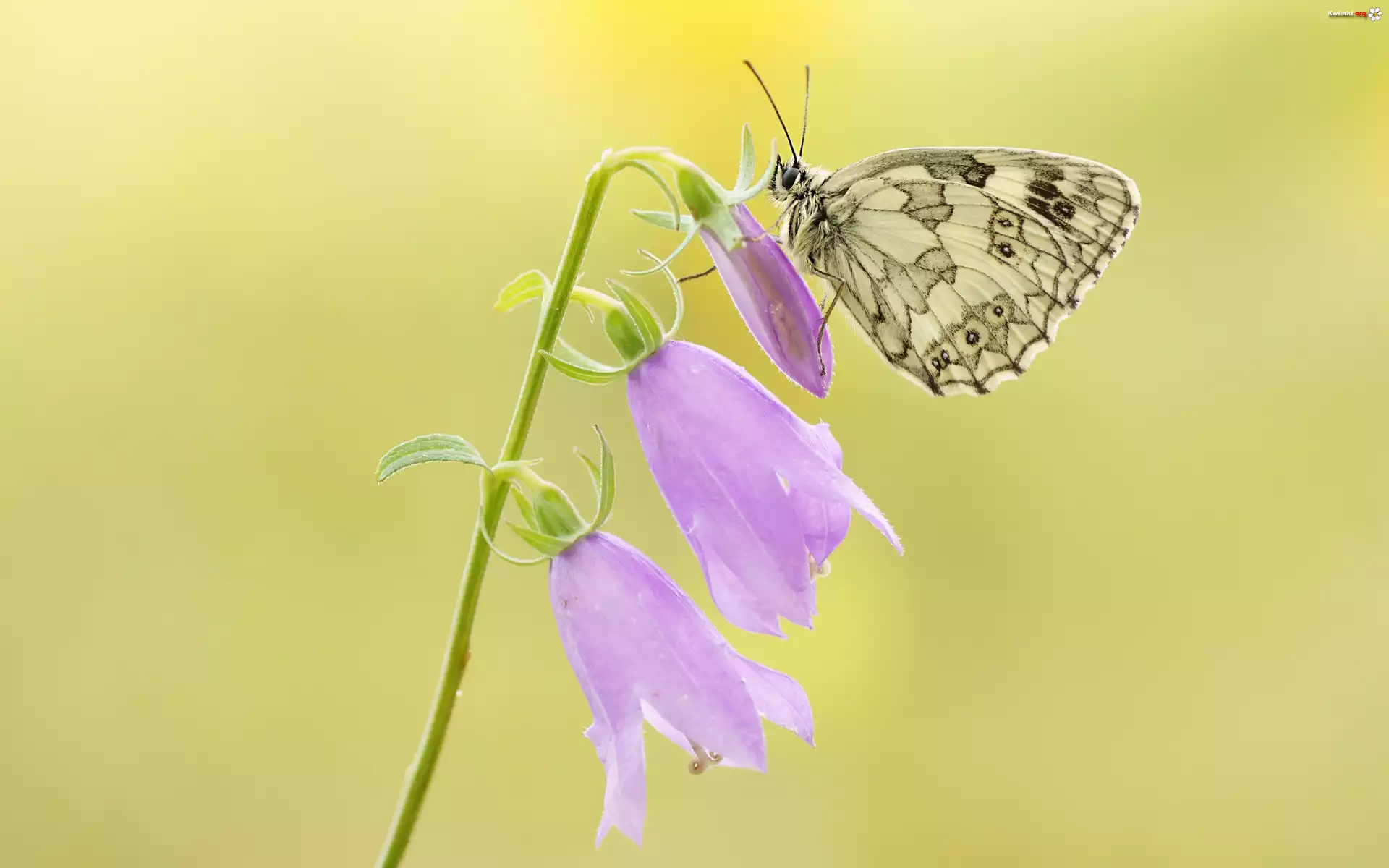 Kwiat, Dzwonki, Motyl, Polowiec szachownica - Zdjęcia