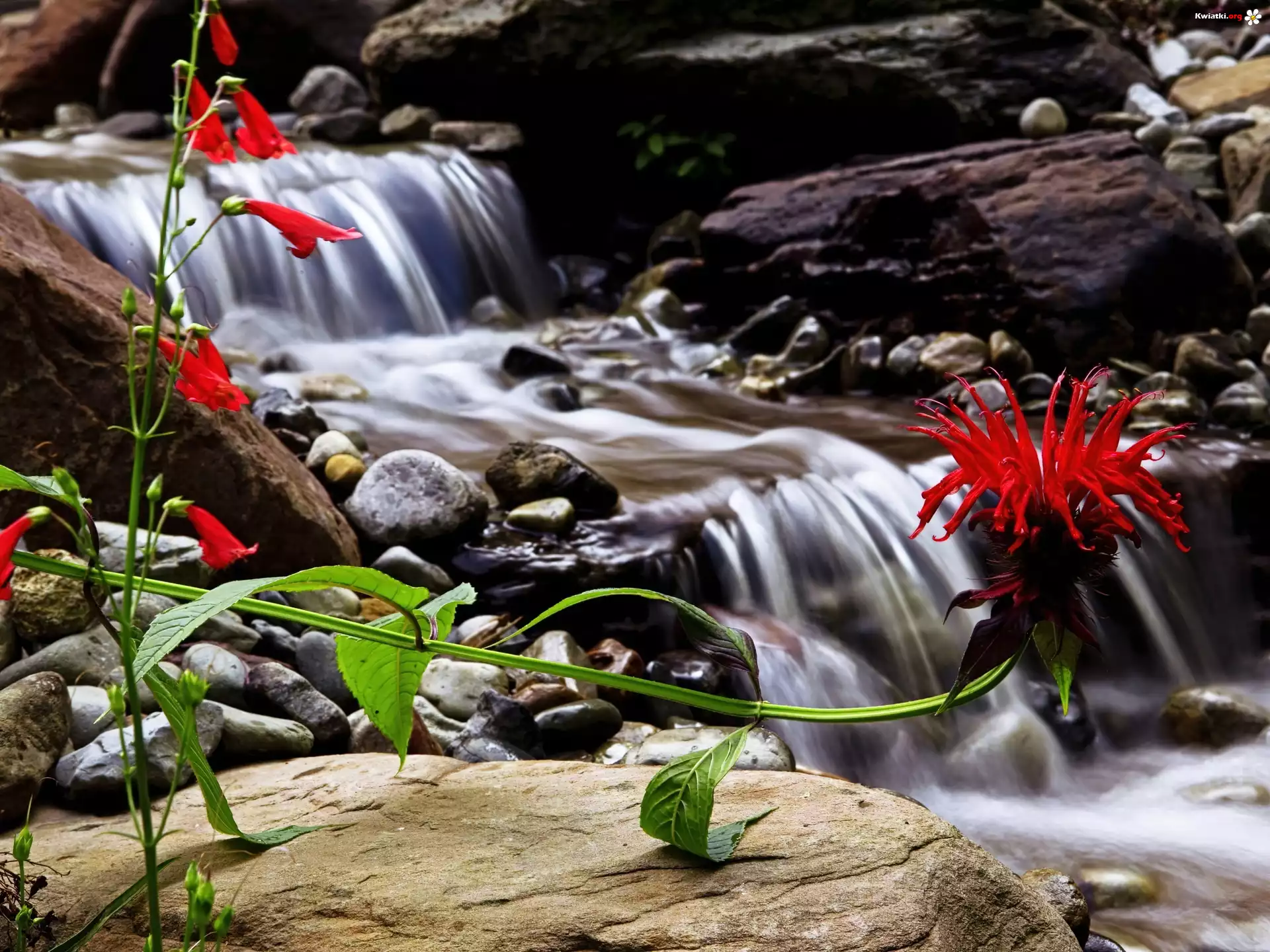 Czerwony, Kwiat, Potok, Wodospad, Kamienie - Zdjęcia