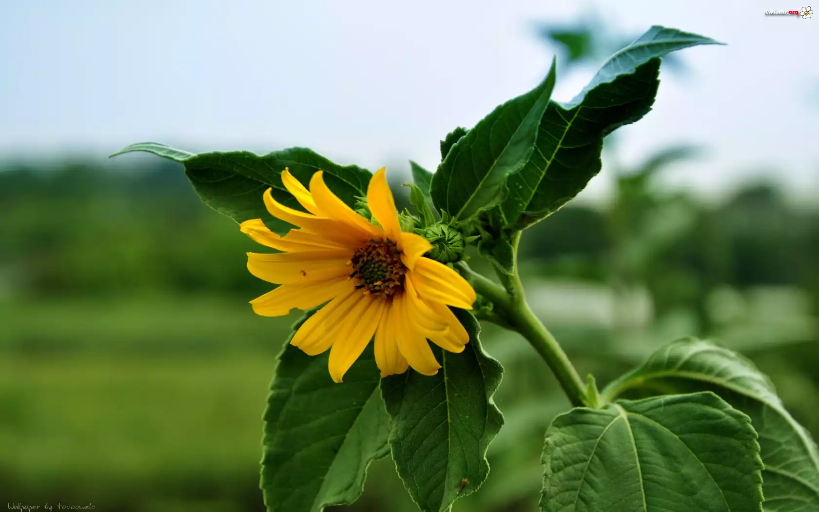 Kwiat Kwiat, Żółty, Słonecznik, Zielone, Liście