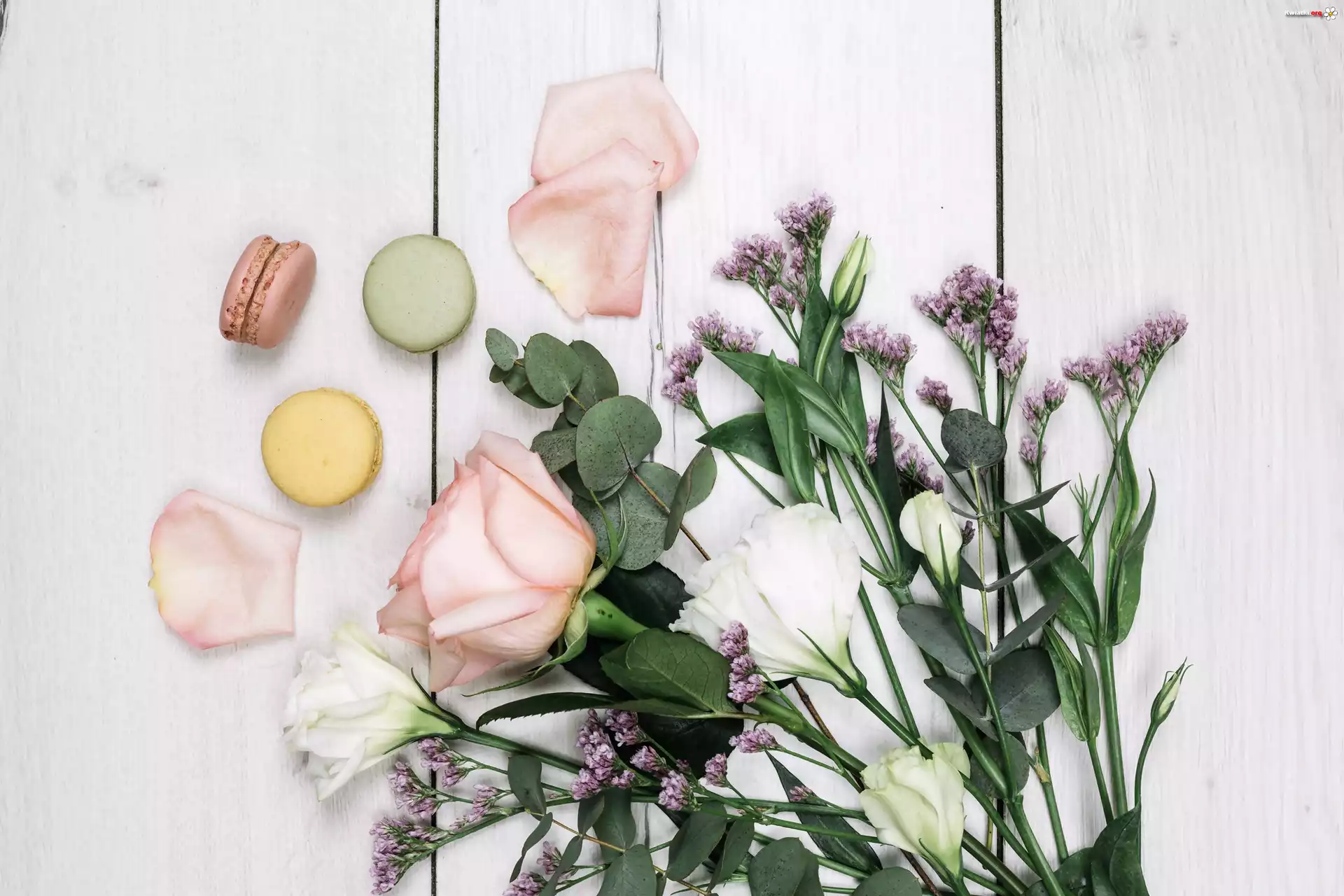 Kwiatki, Eustoma, Róża, Zatrawian, Makaroniki, Deski - Zdjęcia