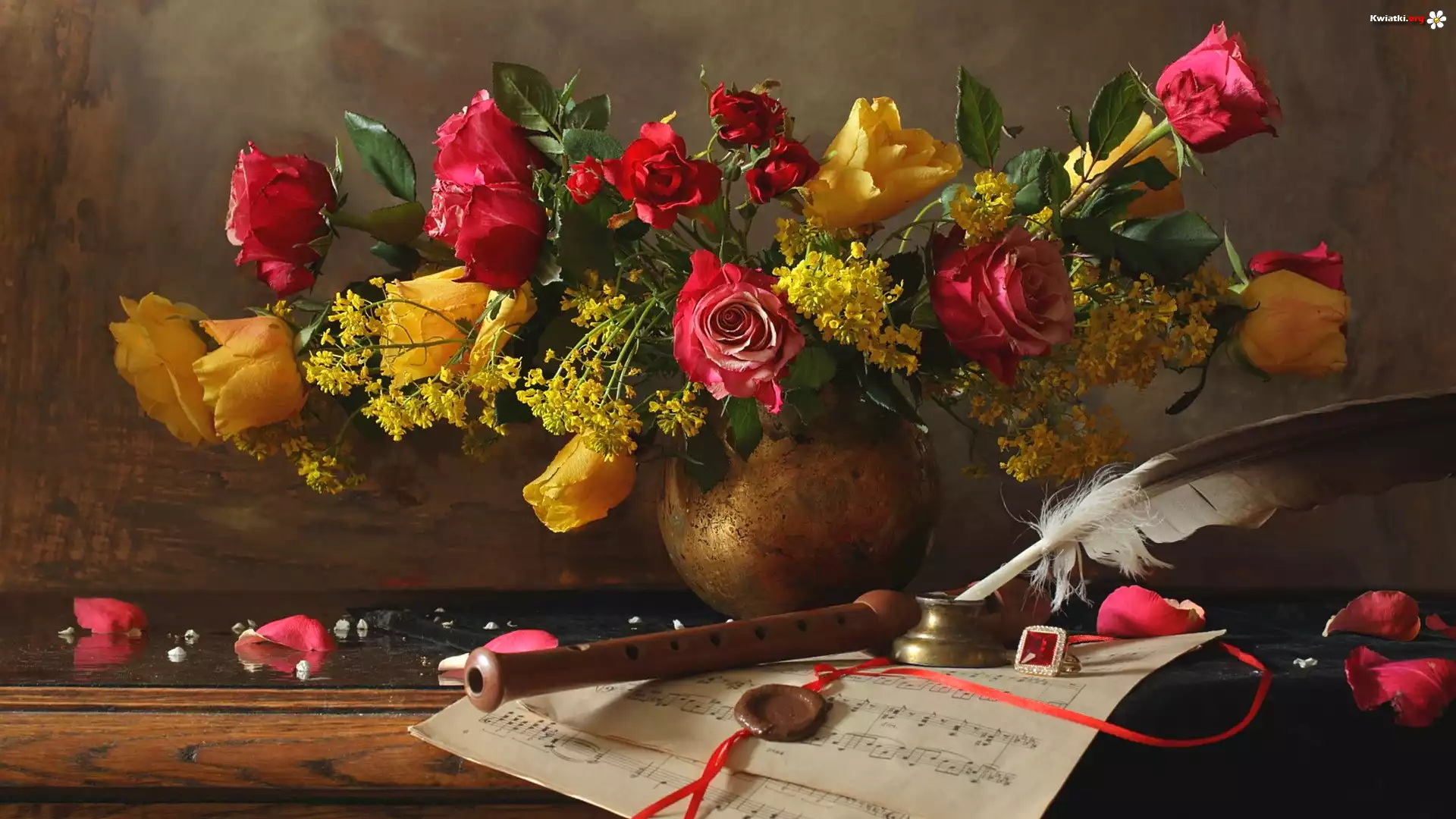 Kwiat Bukiet kwiatów, Róże, Wazon, Flet, Nuty, Pióro
