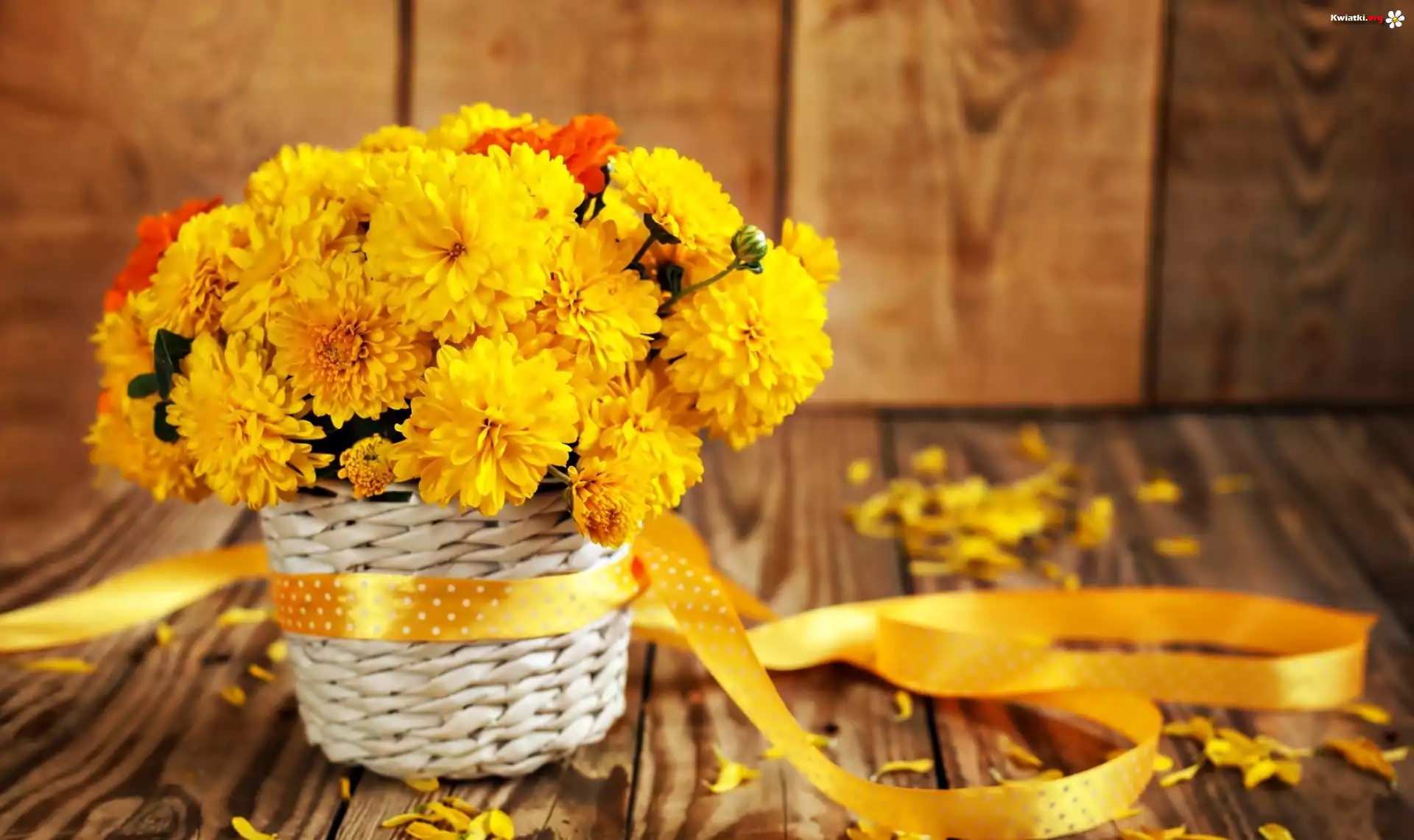 Bukiet, Kwiatów, Żółte, Chryzantemy, Koszyczek, Wstążka, Płatki - Zdjęcia