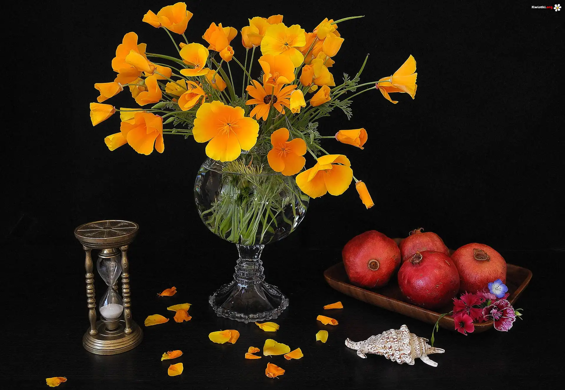 Kompozycja, Bukiet, Maki, Żółte, Granaty, Muszelka, Klepsydra Bukiet Kwiatów - Zdjęcia