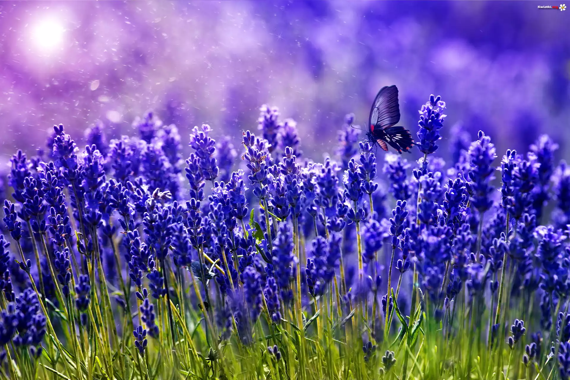 Fioletowe, Kwiaty, Lawenda, Motyl - Zdjęcia