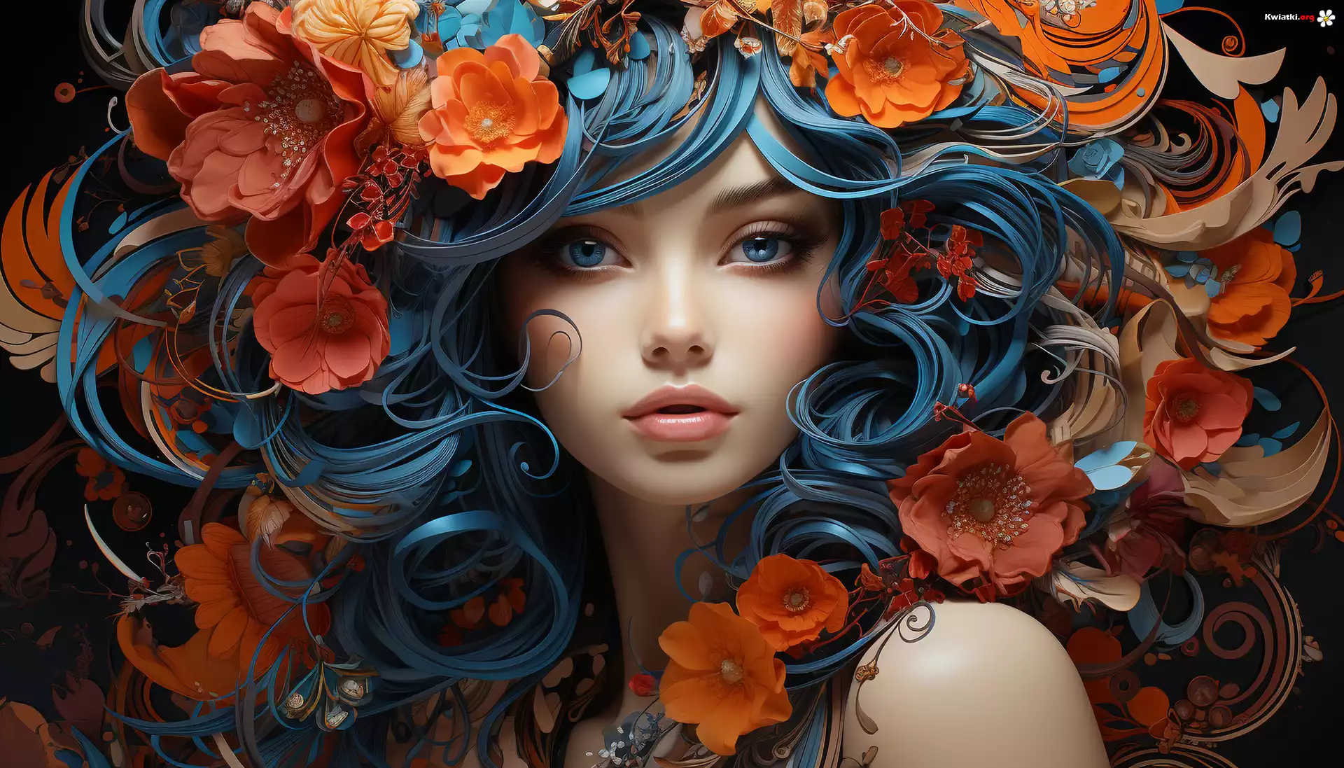 Dziewczyna, Niebieskie, Włosy, Kwiaty, Grafika 2D - Zdjęcia