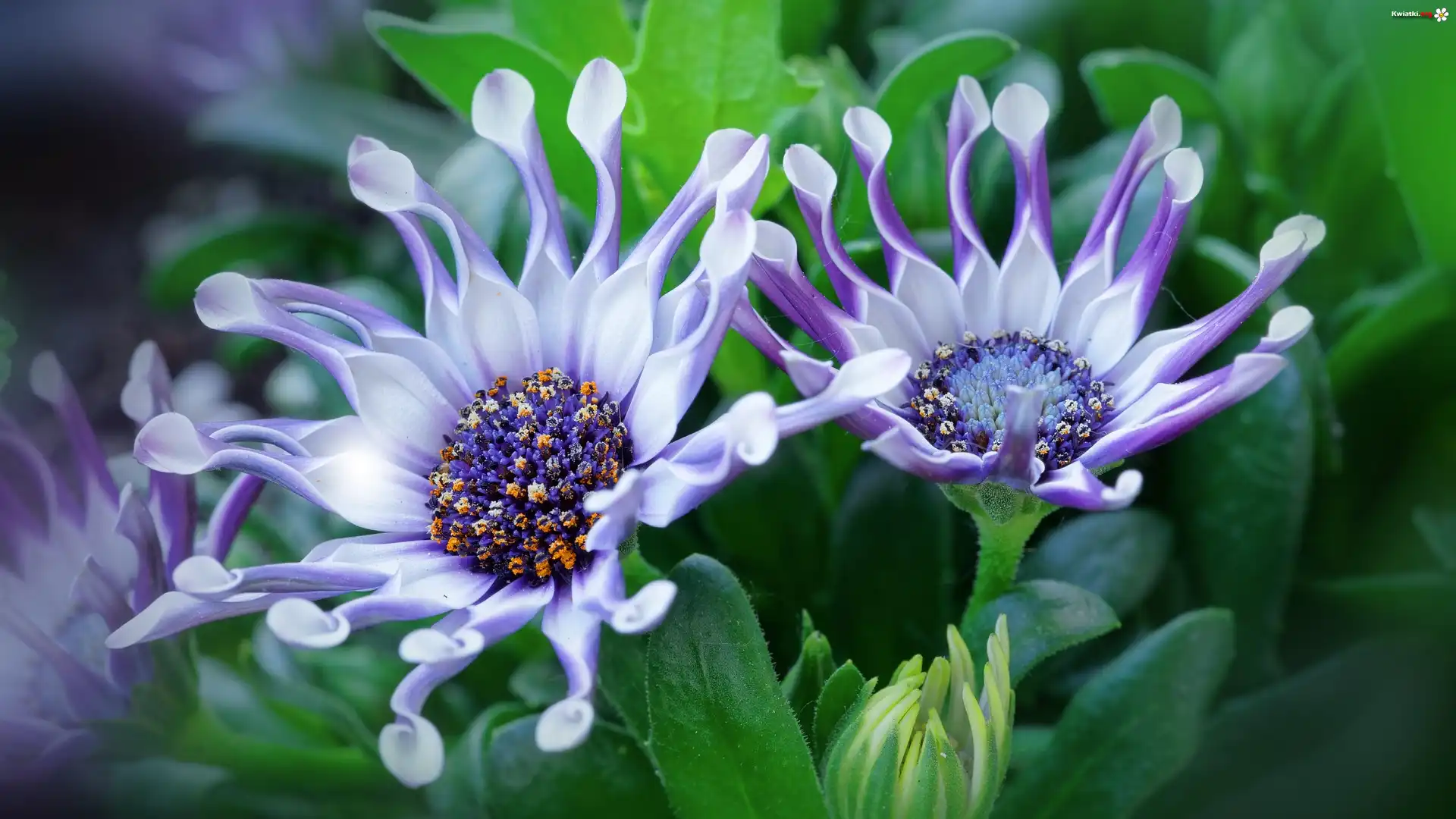 Kwiaty, Biało-fioletowe, Stokrotki afrykańskie, Liście - Zdjęcia