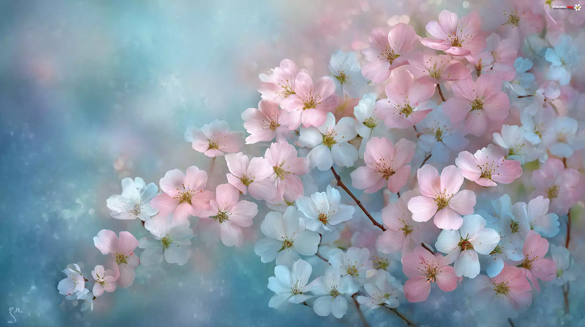 Różowe, Niebieskie, Białe, Kwiaty, Grafika AI - Zdjęcia