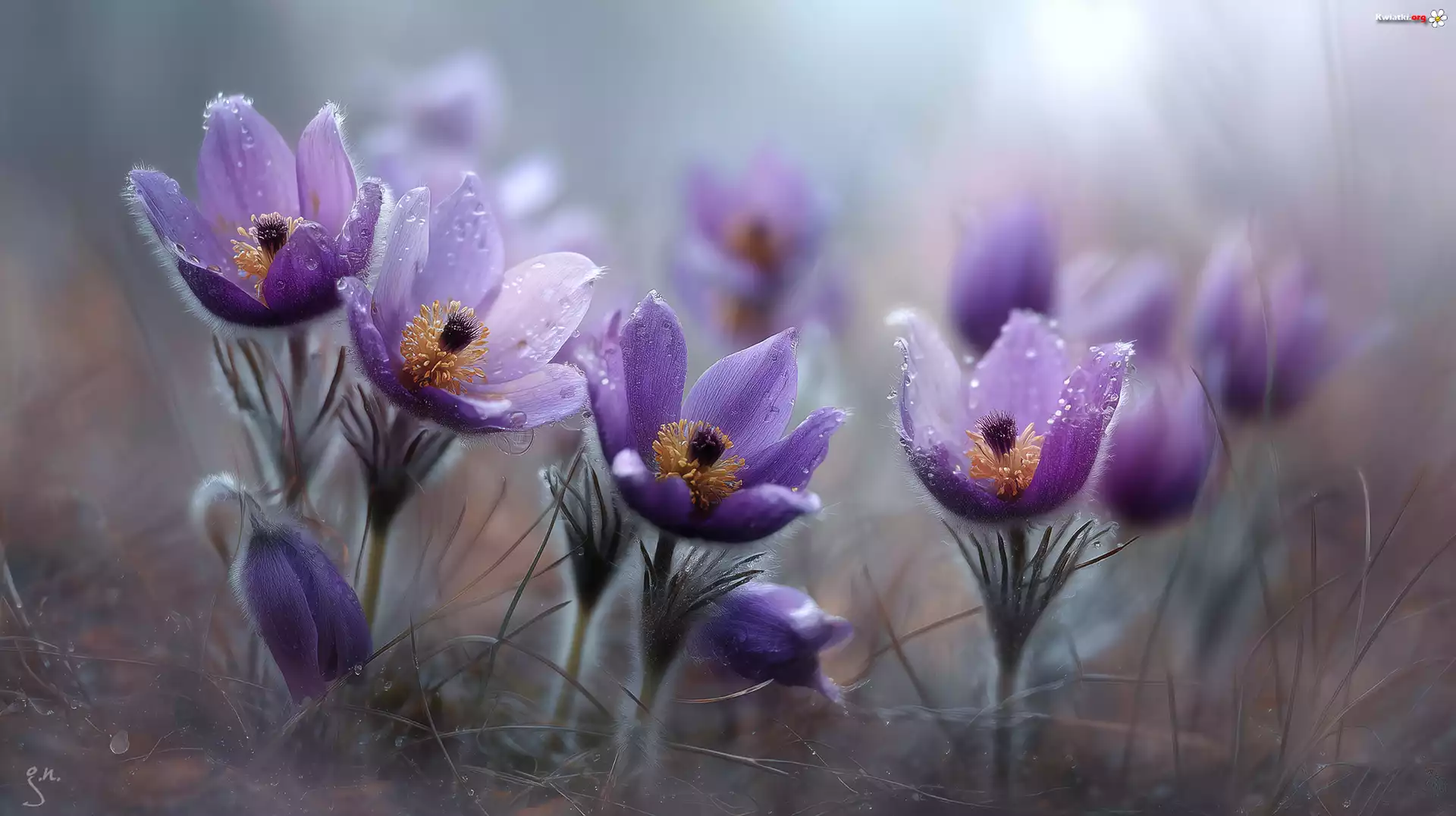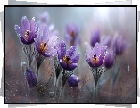Mokre, Fioletowe, Sasanki, Kwiaty, Grafika AI - Zdjęcia