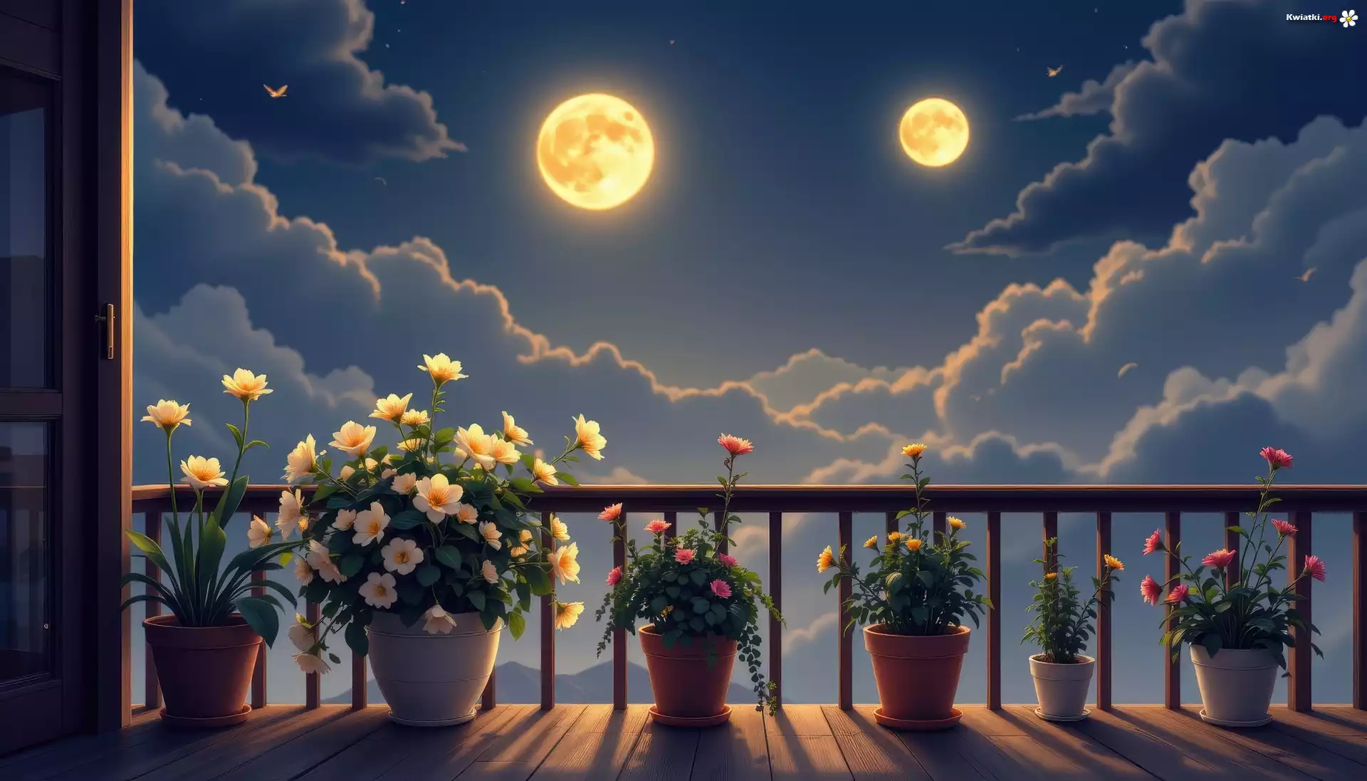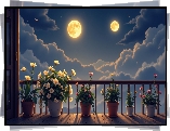 Kwiat Noc, Księżyce, Chmury, Kwiaty, Doniczki, Balkon