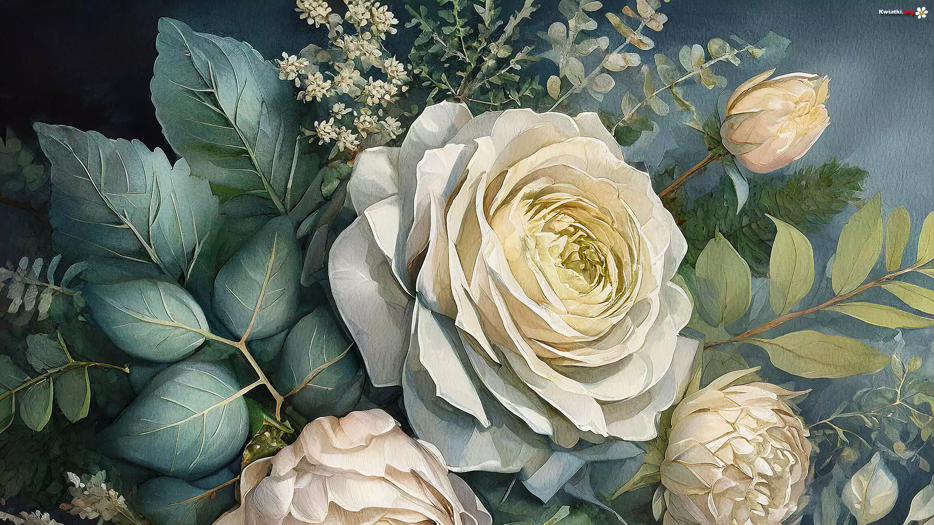 Malarstwo, Kwiaty, Białe, Róże, Listki - Zdjęcia