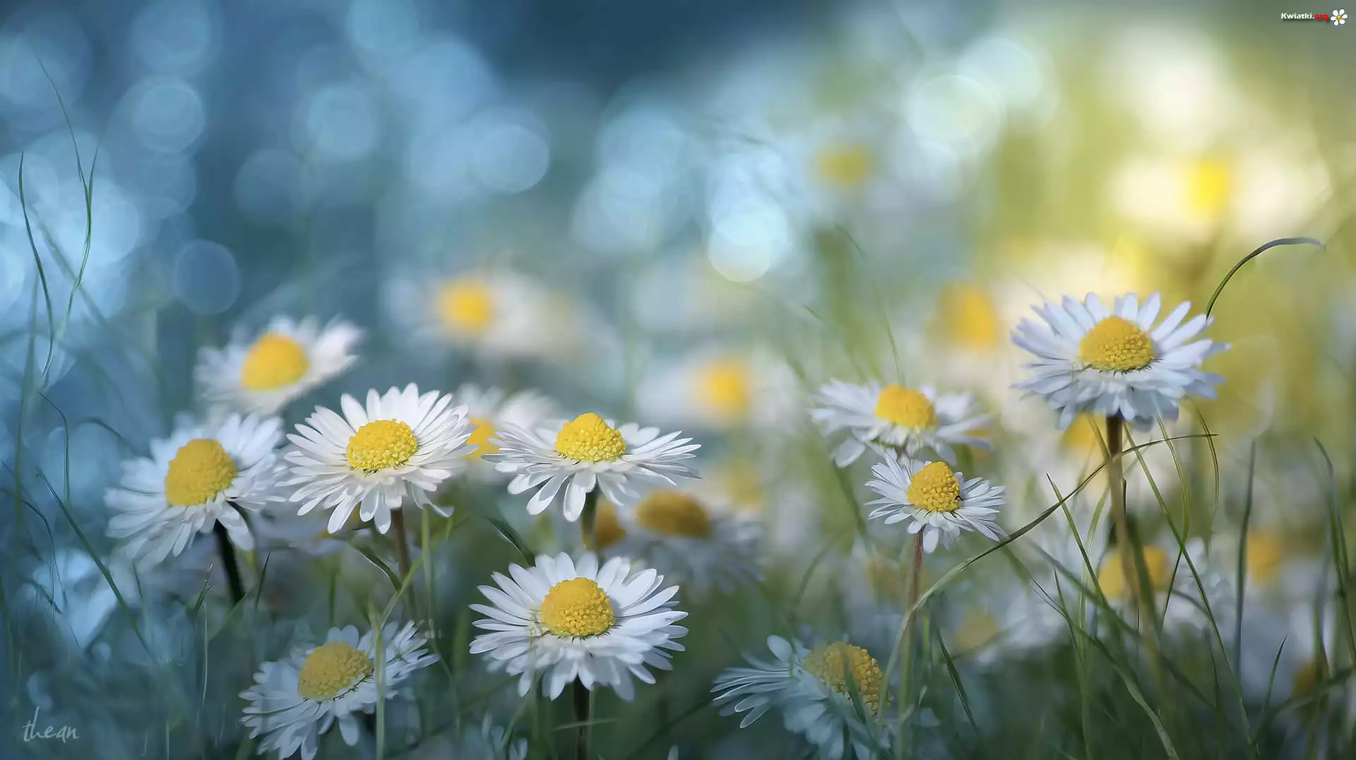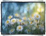 Kwiat Rozświetlone, Stokrotki, Białe, Kwiaty, Trawa, Grafika AI