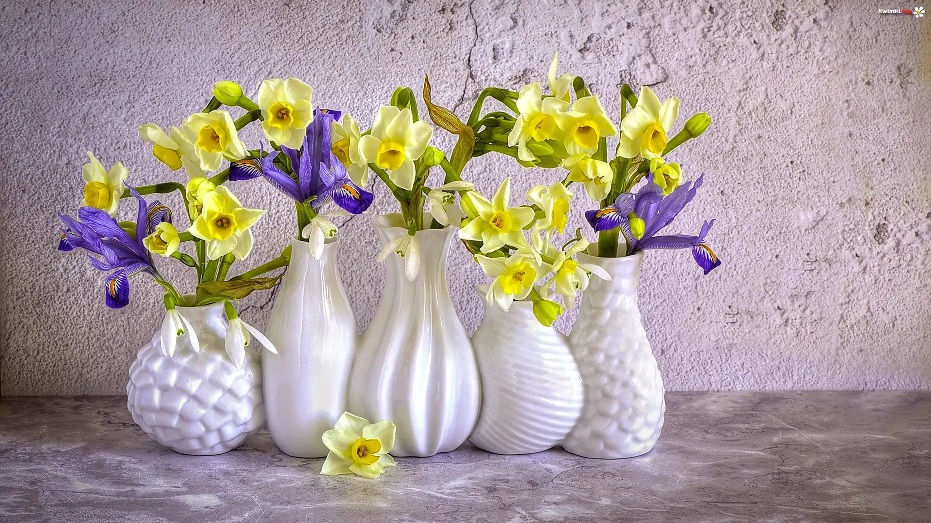 Kwiaty, Narcyzy żonkile, Irysy, Białe, Wazony - Zdjęcia
