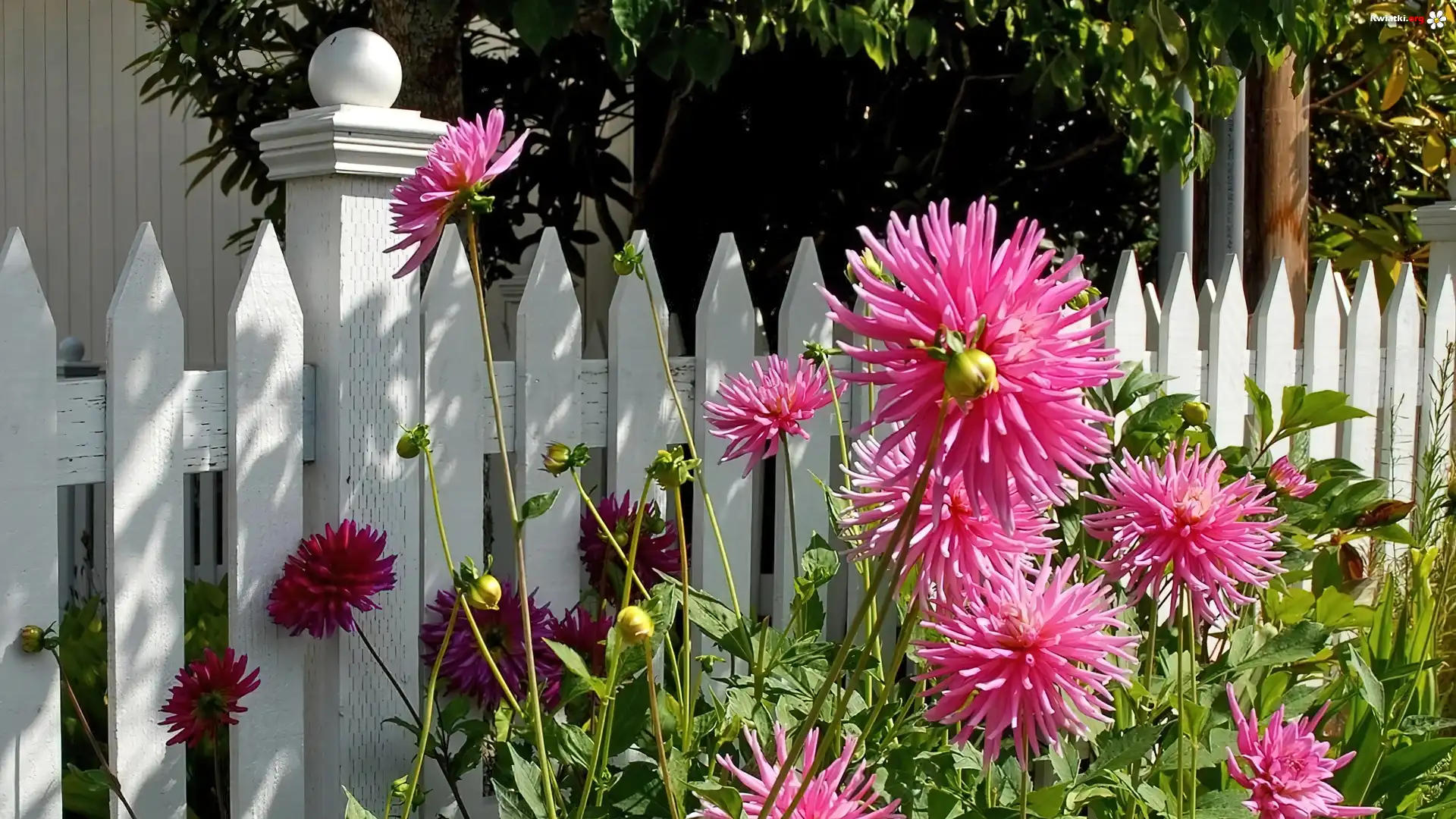 Kwiaty, Dalie, Biały, Płotek - Zdjęcia