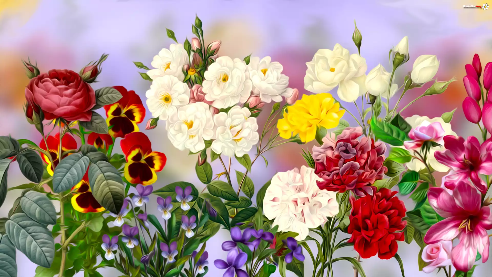 Kwiaty, Róże, Goździki, Bratki, Grafika - Zdjęcia