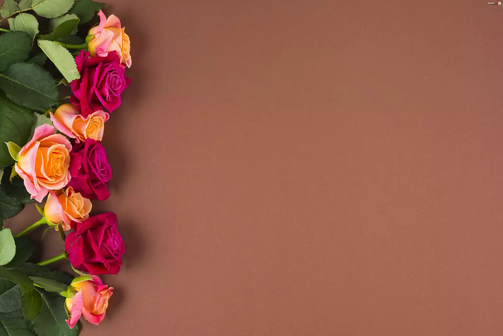 Kwiaty, Kolorowe, Róże, Liście, Brązowe, Tło - Zdjęcia