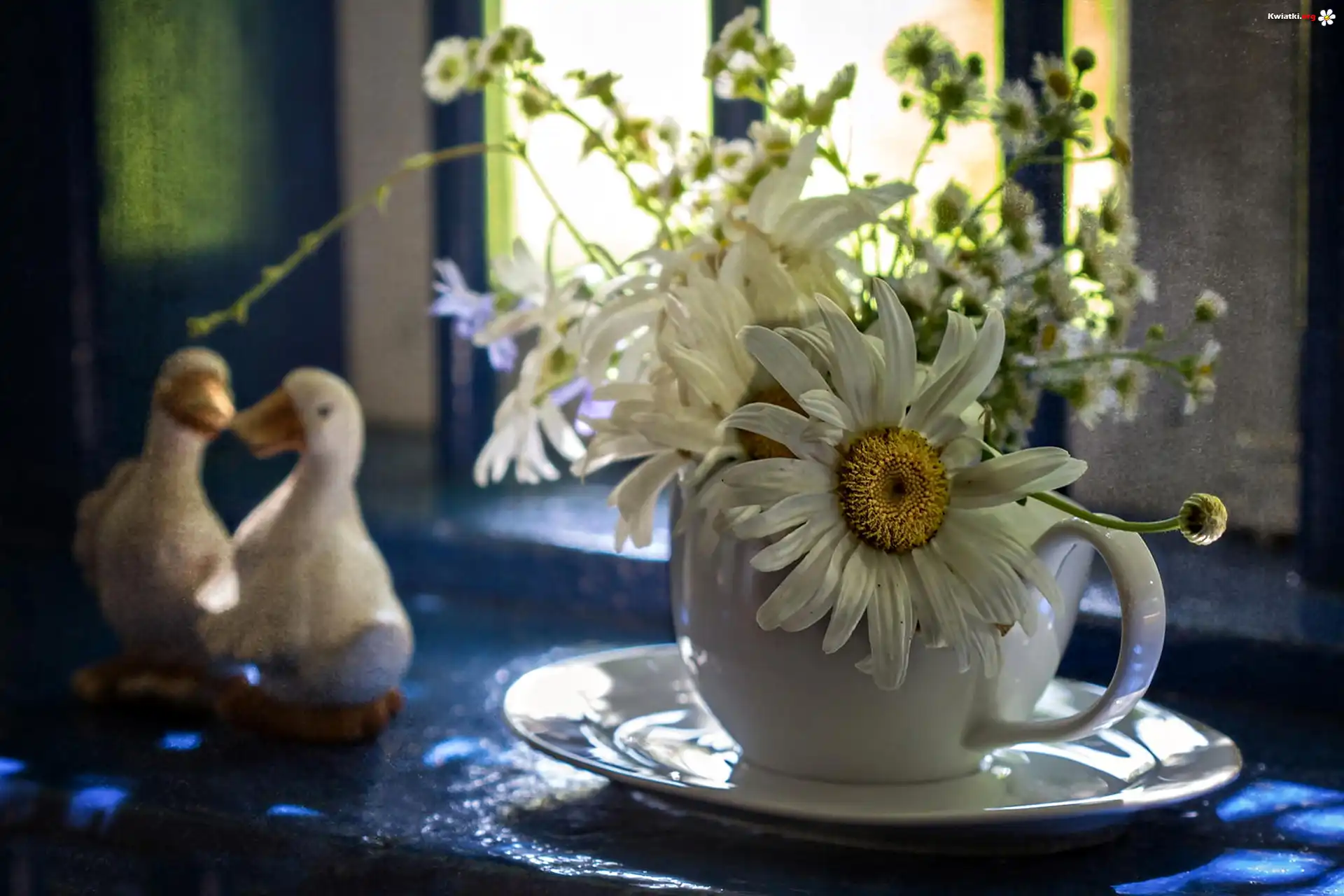 Bukiet, Kwiaty, Rumianki, Filiżanka, Talerzyk, Figurki, Kaczki - Zdjęcia