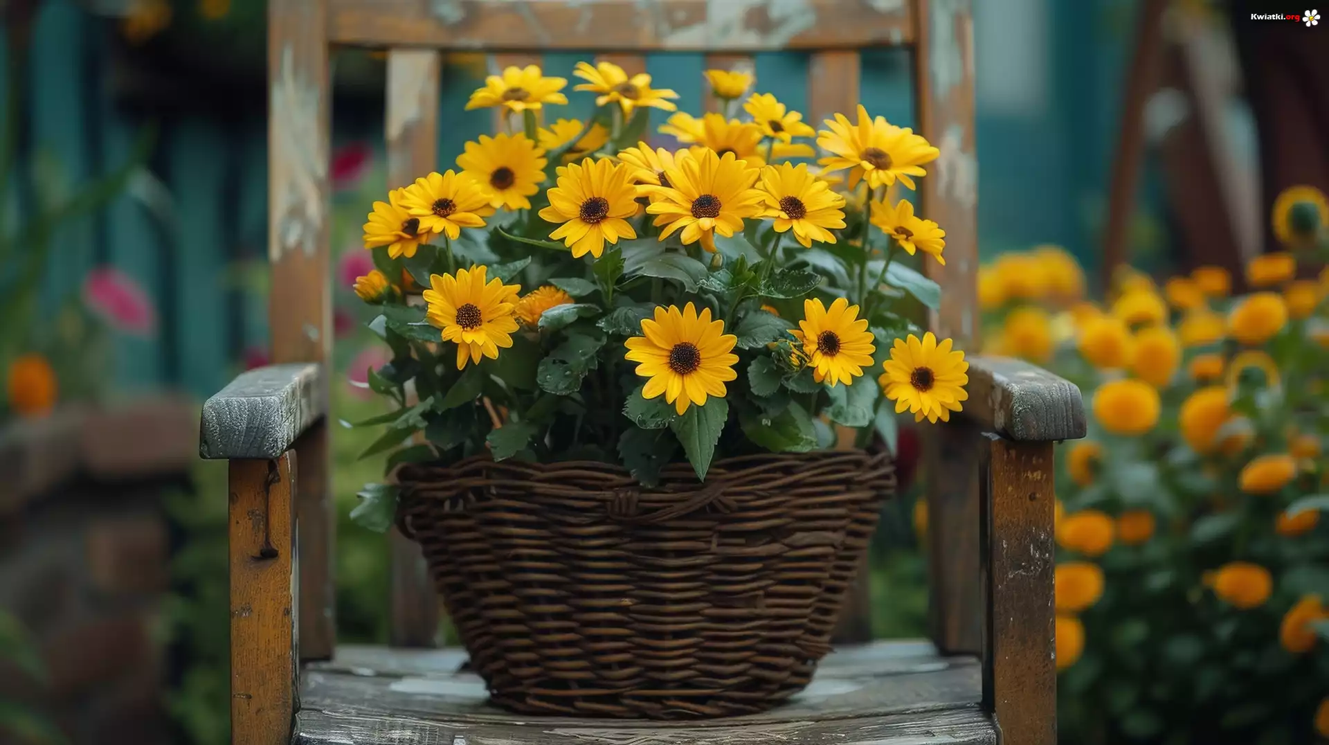 Kwiat Żółte, Kwiaty, Bukiet, Koszyk, Krzesło
