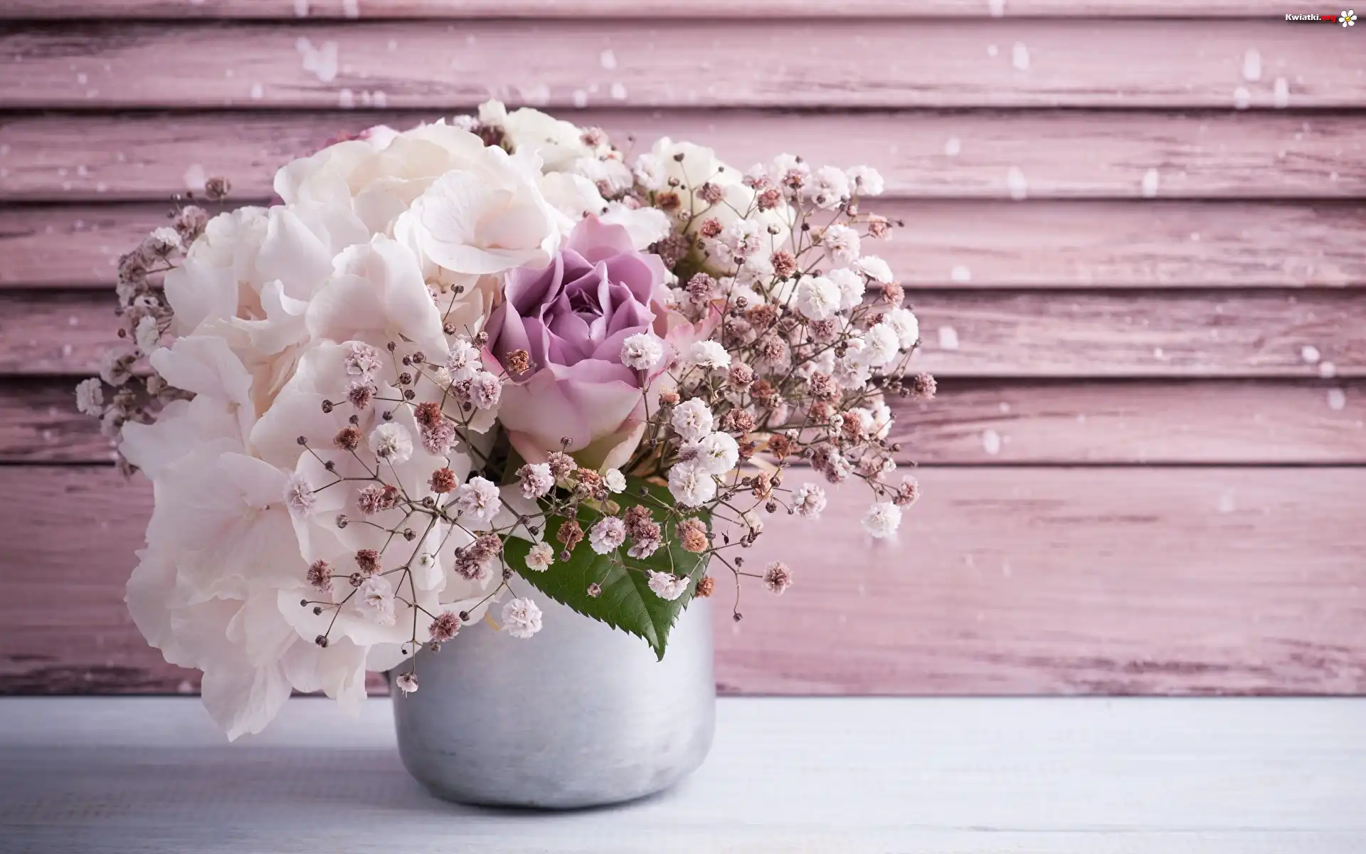 Kwiaty, Hortensja, Róża, Gipsówka, Bukiet, Wazon - Zdjęcia