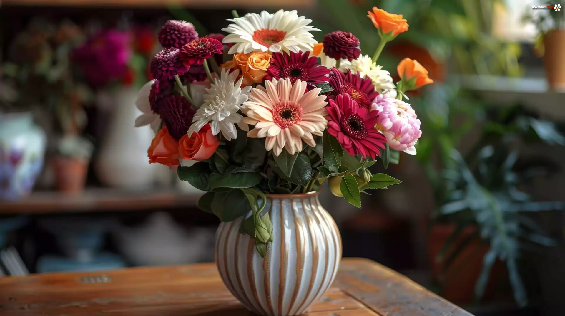 Kwiat Różnokolorowe, Kwiaty, Bukiet, Wazon, Stół