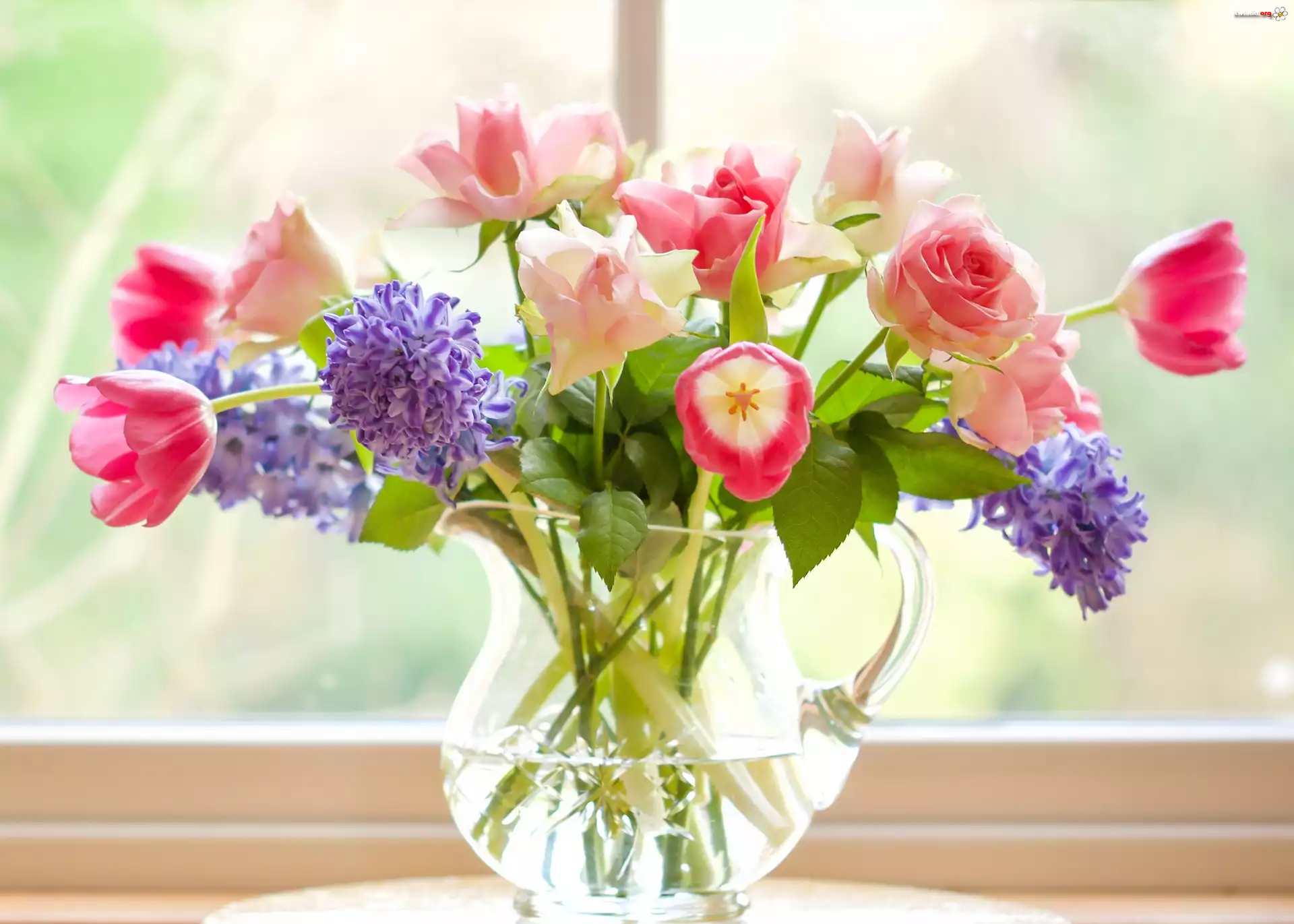 Kwiat Kwiaty, Hiacynty, Tulipany, Róże, Bukiet, Dzbanek