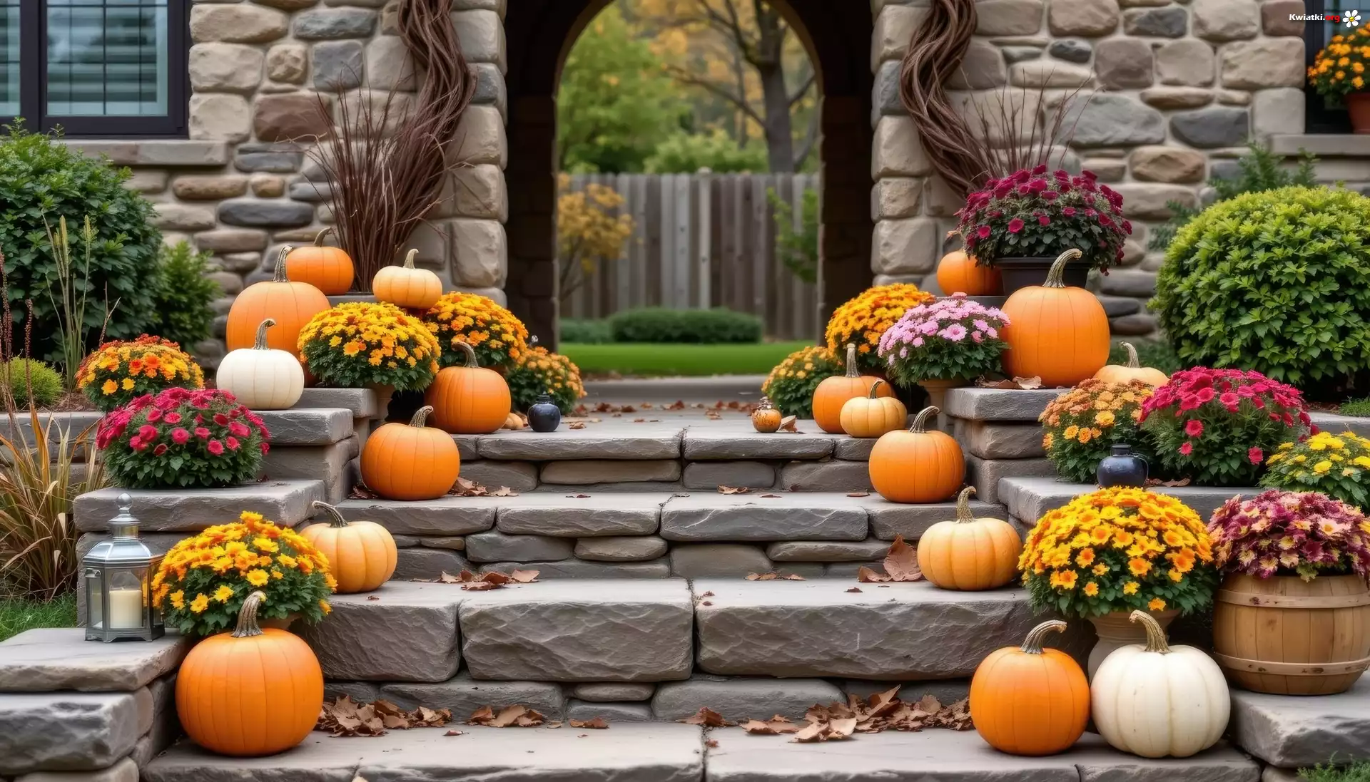 Dynie, Kwiaty, Chryzantemy, Schody, AI - Zdjęcia