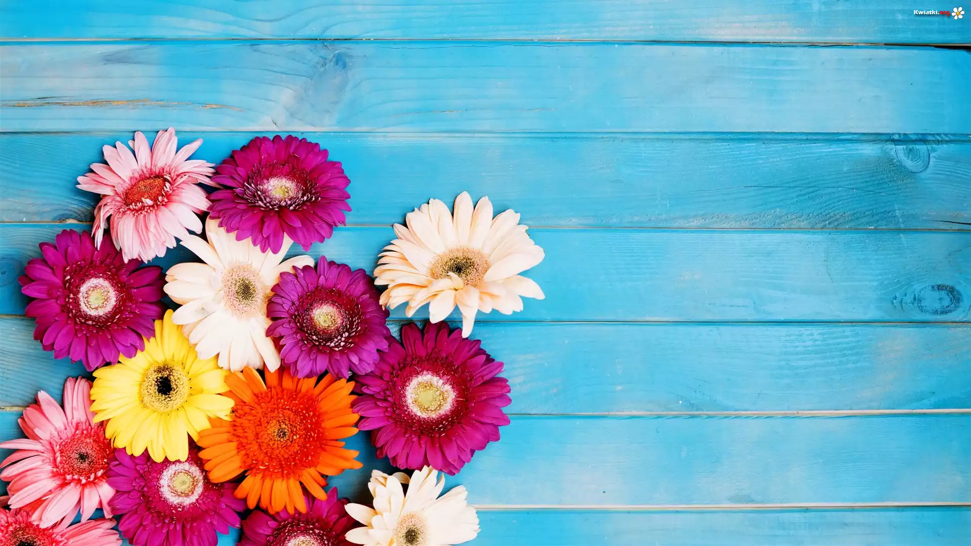Kwiaty, Kolorowe, Gerbery, Deski, Niebieskie - Zdjęcia