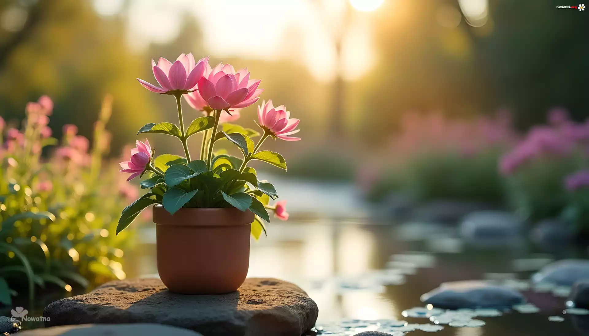 Różowe, Kwiaty, Doniczka, Staw, Grafika - Zdjęcia