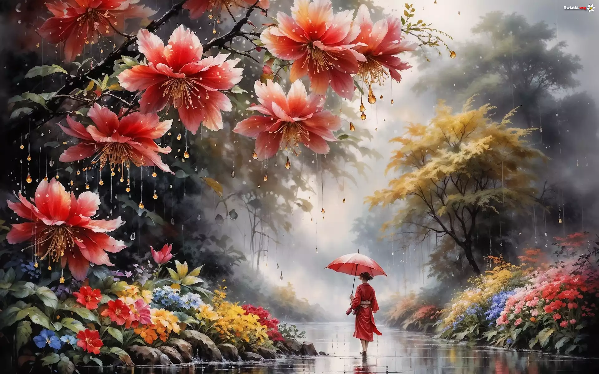 Kwiat Grafika, Deszcz, Droga, Kwiaty, Drzewo, Kobieta, Parasol