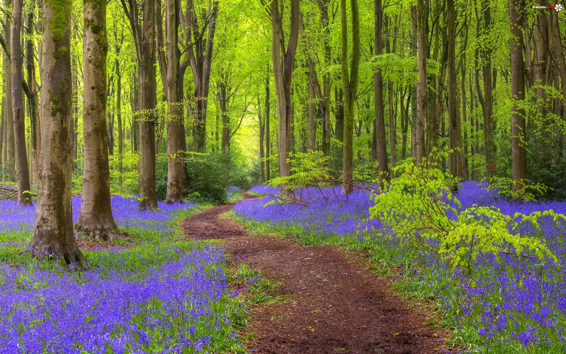 Kwiat Las, Droga, Drzewa, Kwiaty, Hiacyntowce zwyczajne, Wiosna