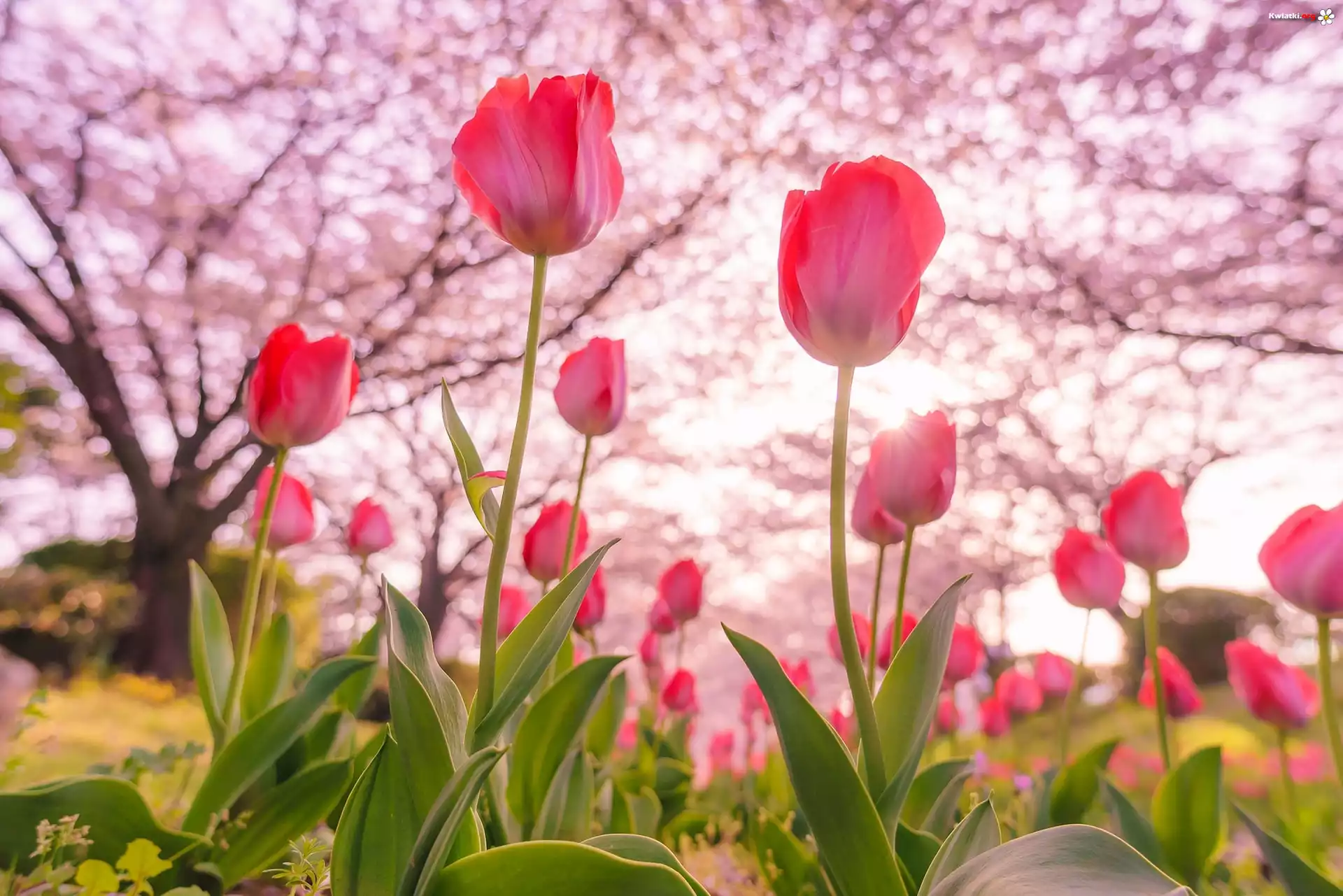 Kwiaty, Tulipany, Drzewa, Wiosna - Zdjęcia