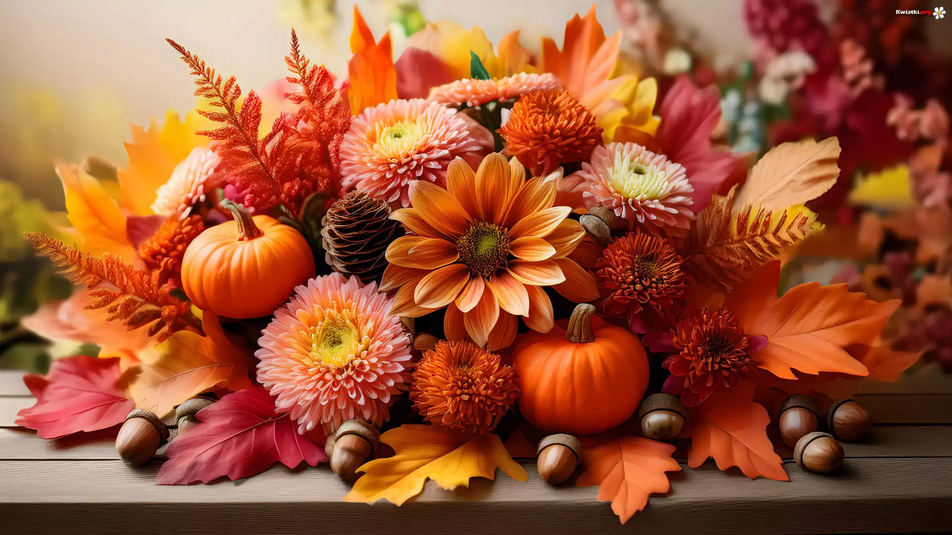 Liście, Bukiet, Dynie, Kwiaty, Żołędzie, Kompozycja, Grafika - Zdjęcia