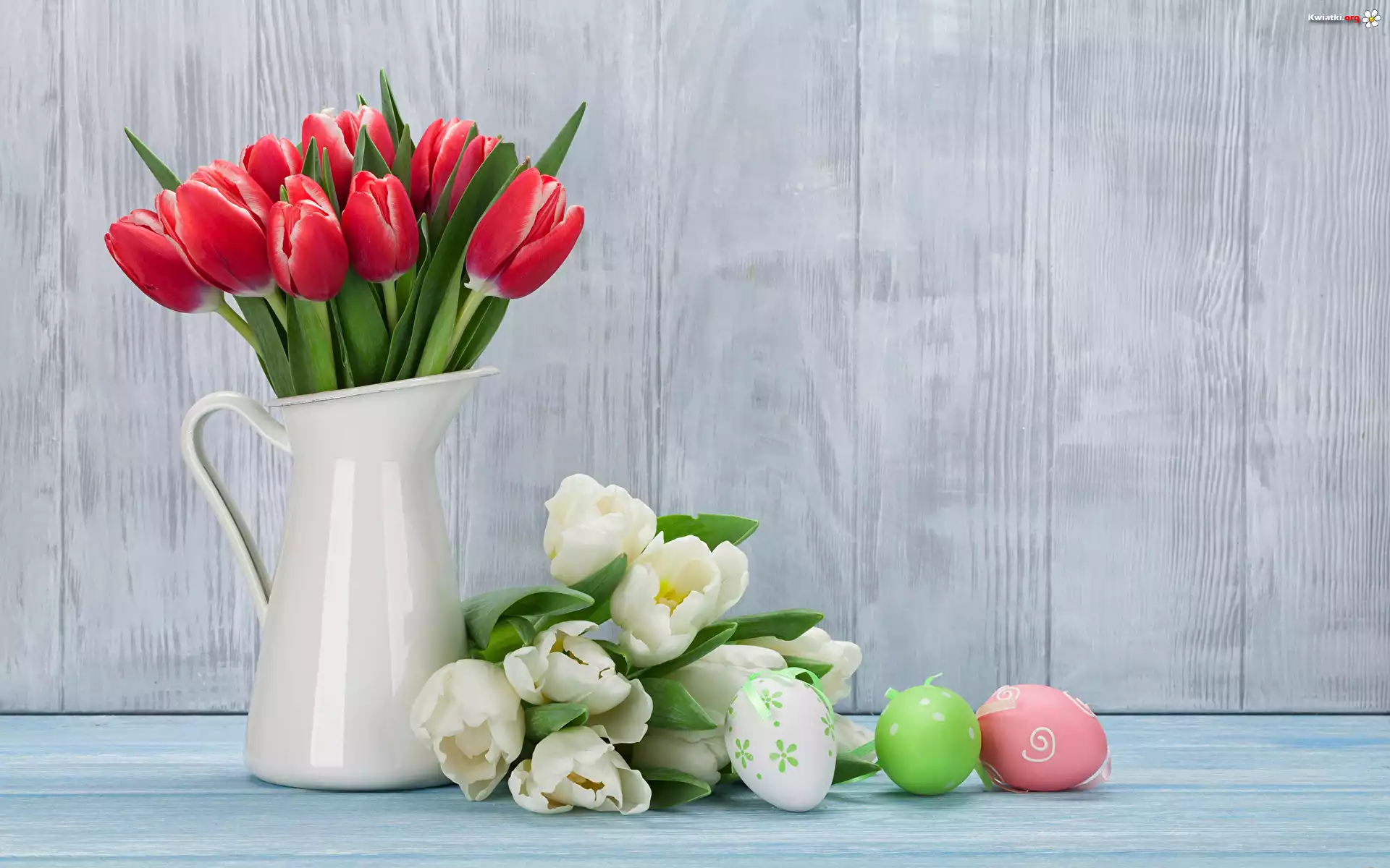 Kwiaty, Dwa, Bukiety, Tulipany, Czerwone, Białe, Dzbanek, Pisanki, Deski - Zdjęcia
