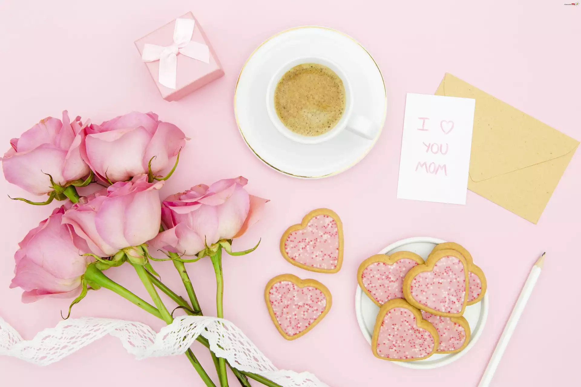 Kwiaty, Róże, Wstążka, Prezent, Talerzyk, Ciasteczka, Serduszka, Filiżanka, Kawa, Kartka, Napis, Koperta, Ołówek, Dzień Matki - Zdjęcia |