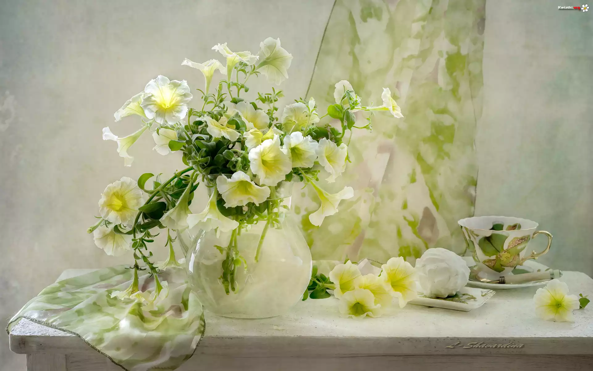 Kwiaty, Białe, Petunie, Wazon, Filiżanka, Kompozycja - Zdjęcia