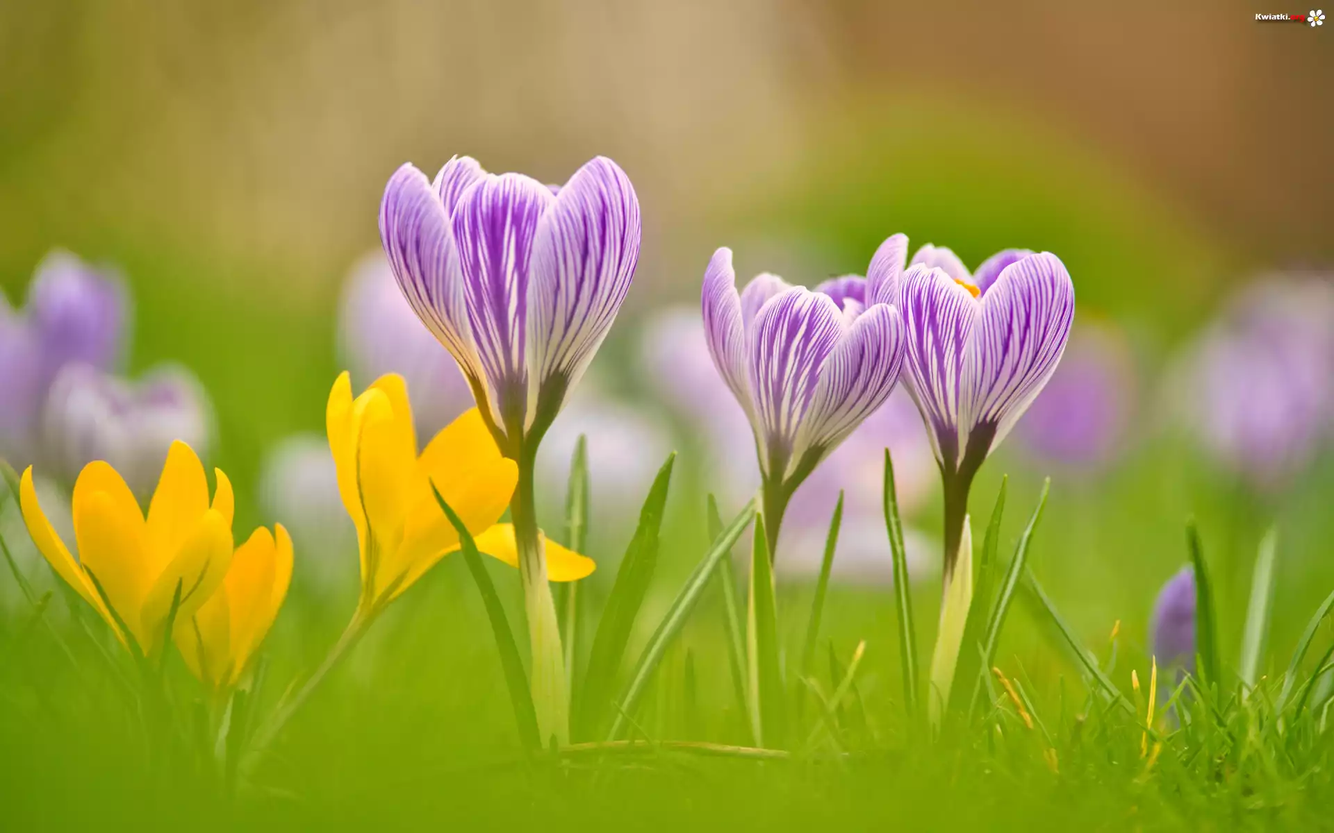 Żółte, Fioletowe, Krokusy, Kwiaty, Trawa - Zdjęcia
