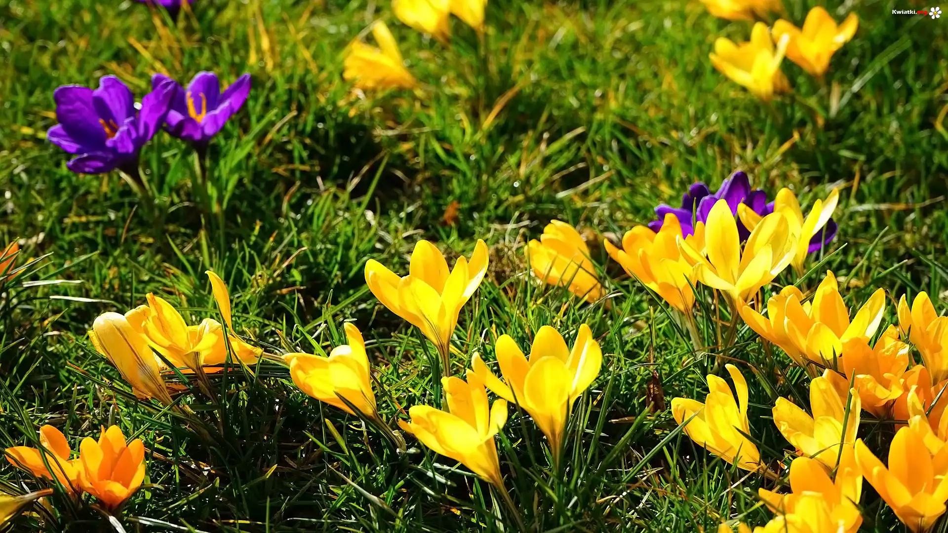 Kwiaty, Krokusy, Żółte, Fioletowe, Trawa - Zdjęcia