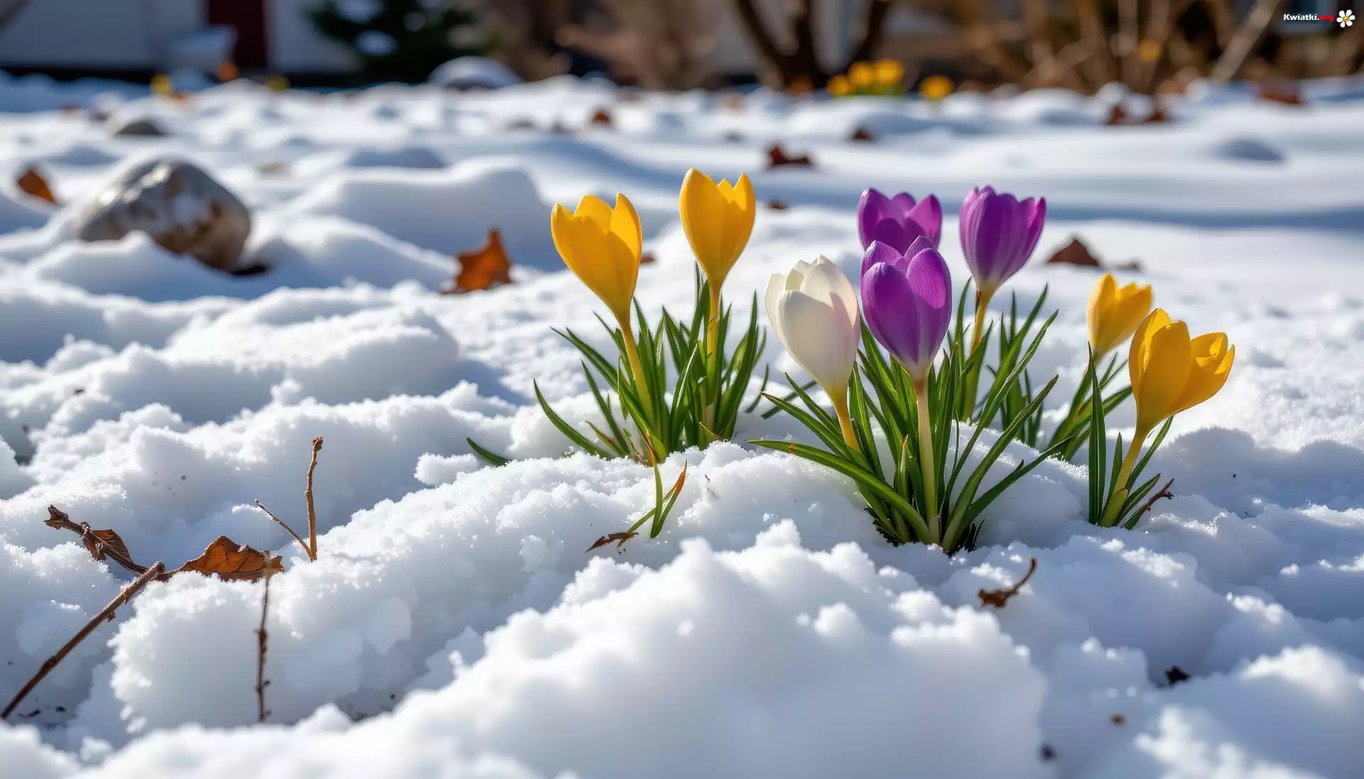 Kwiat Krokusy, Żółte, Fioletowe, Kwiaty, Śnieg, Grafika AI