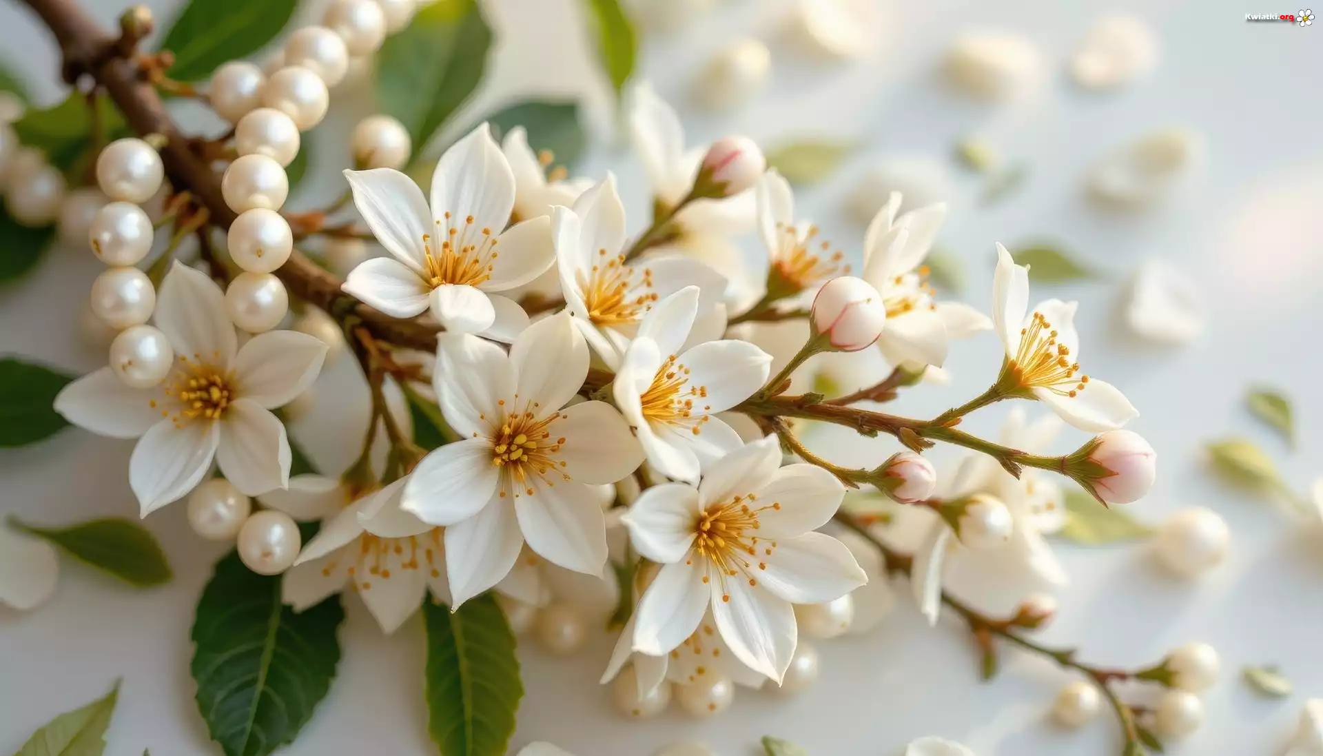Kwiat Białe, Kwiaty, Gałązki, Perły, Korale