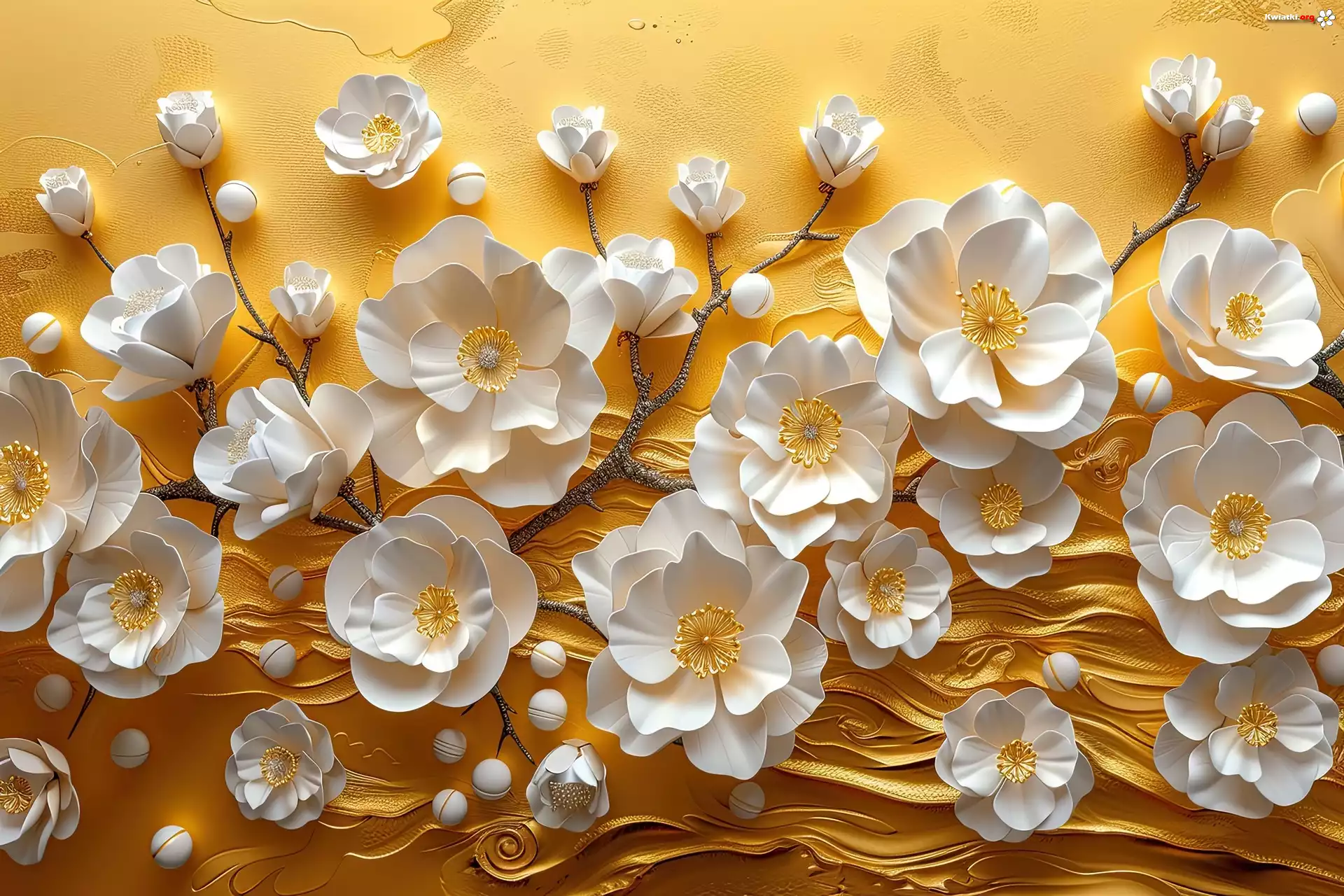 Kwiat Białe, Kwiaty, Gałązki, Żółte, Tło