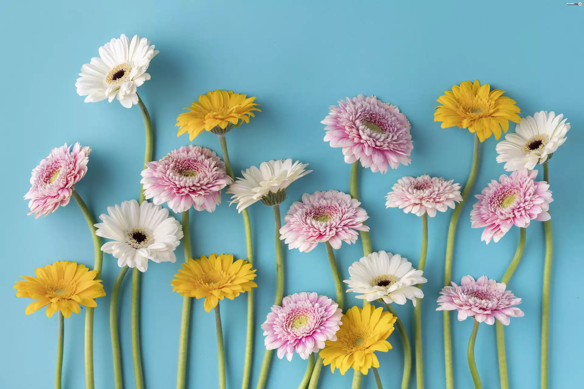 Kwiat Kolorowe, Kwiaty, Gerbery, Niebieskie, Tło