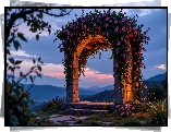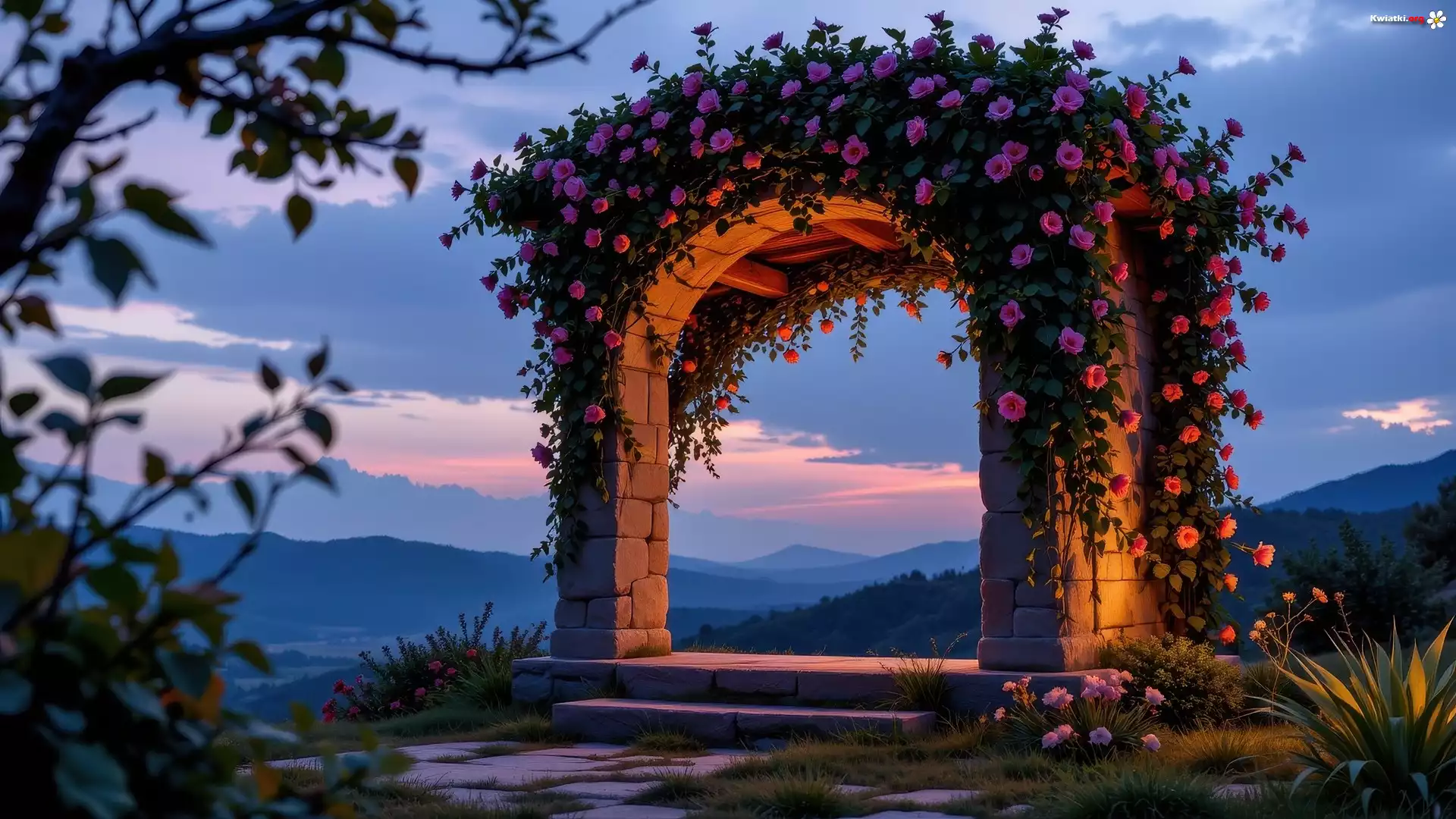 Murowany, Łuk, Różowe, Kwiaty, Rośliny, Góry - Zdjęcia