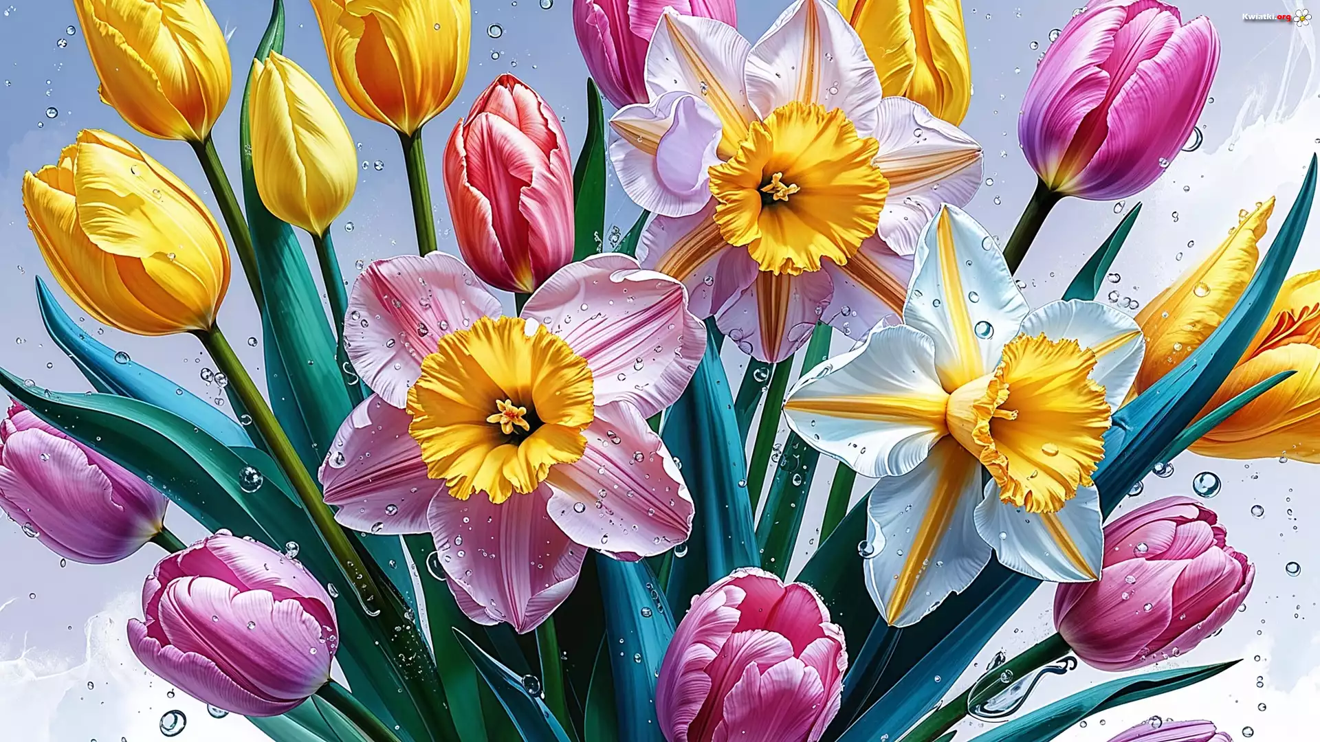Narcyzy, Tulipany, Kolorowe, Kwiaty, Krople, Grafika - Zdjęcia
