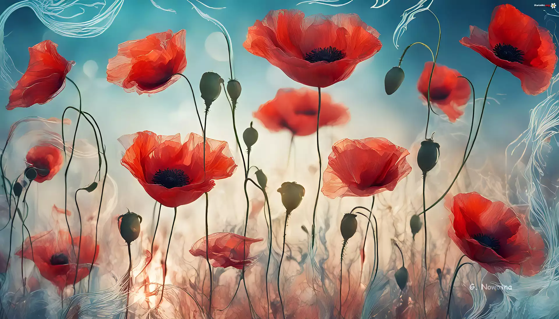 Czerwone, Rozwinięte, Maki, Kwiaty, Pąki, Grafika - Zdjęcia