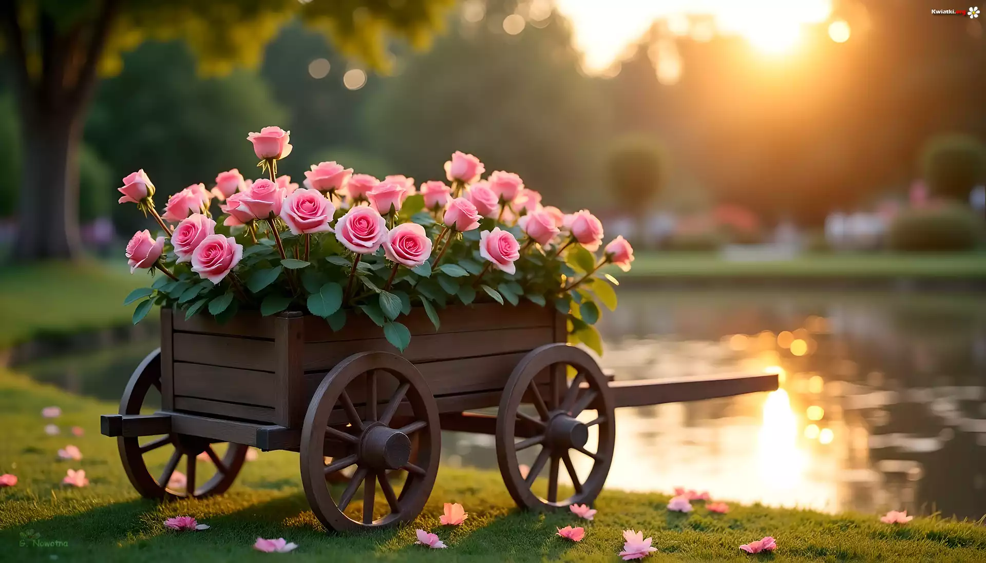 Kwiat Drewniany, Wózek, Róże, Kwiaty, Staw, Grafika