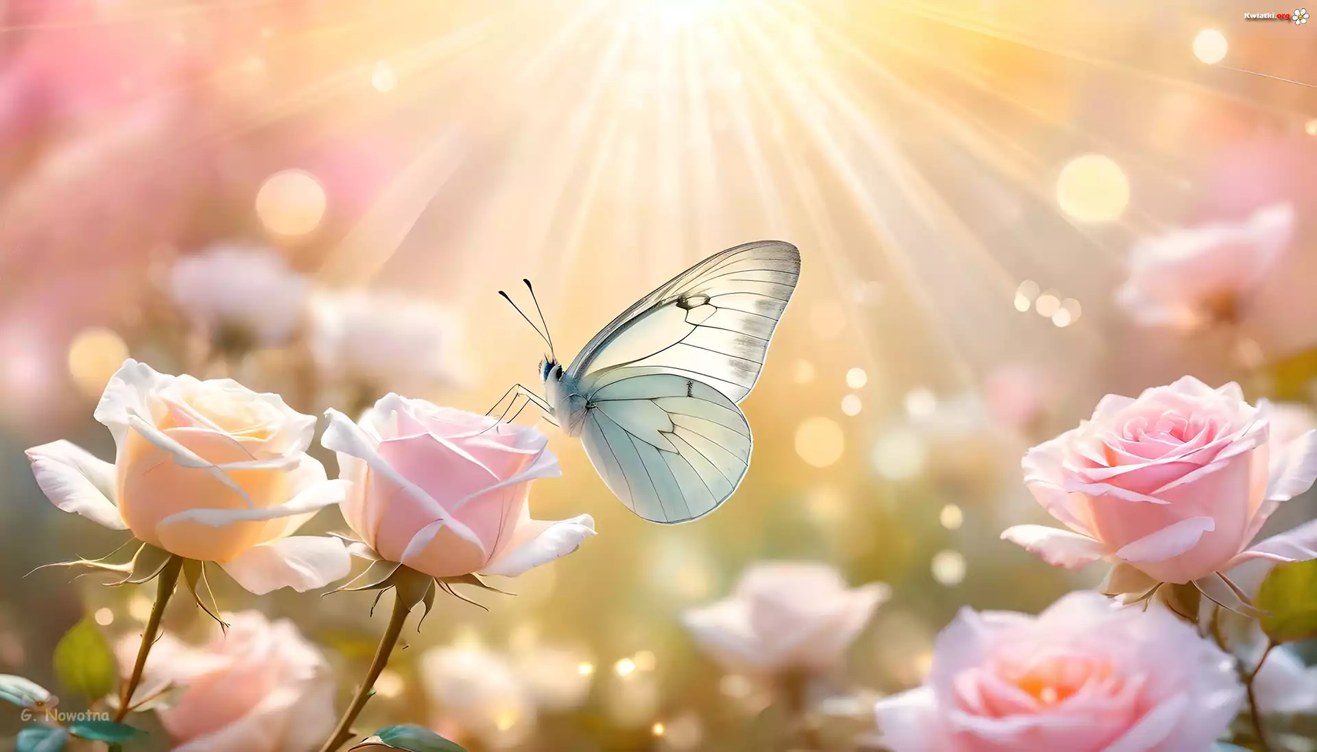 Kwiat Motyl, Różowe, Róże, Kwiaty, Słońce, Grafika