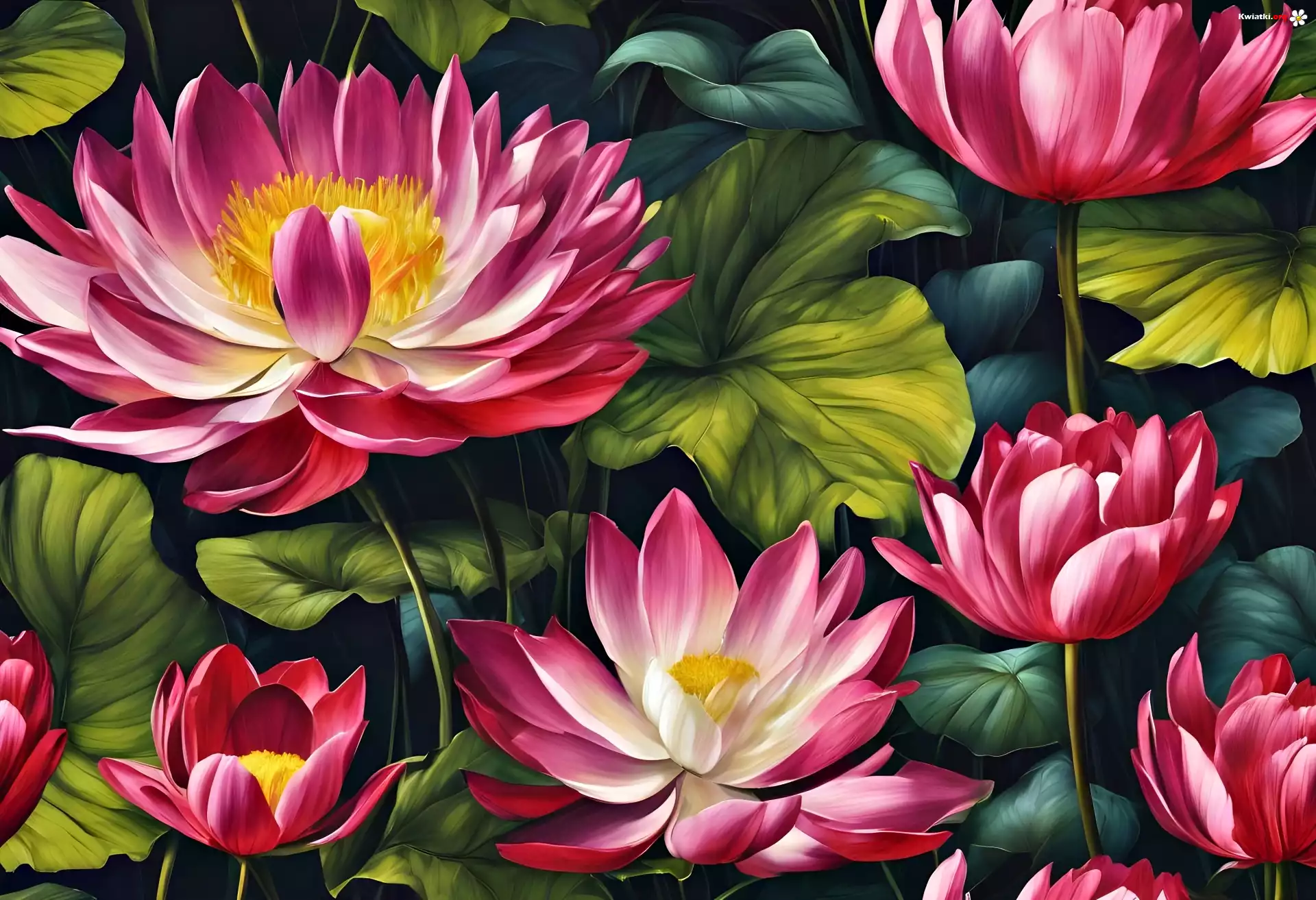 Lilie wodne, Różowe, Kwiaty, Liście, Grafika - Zdjęcia